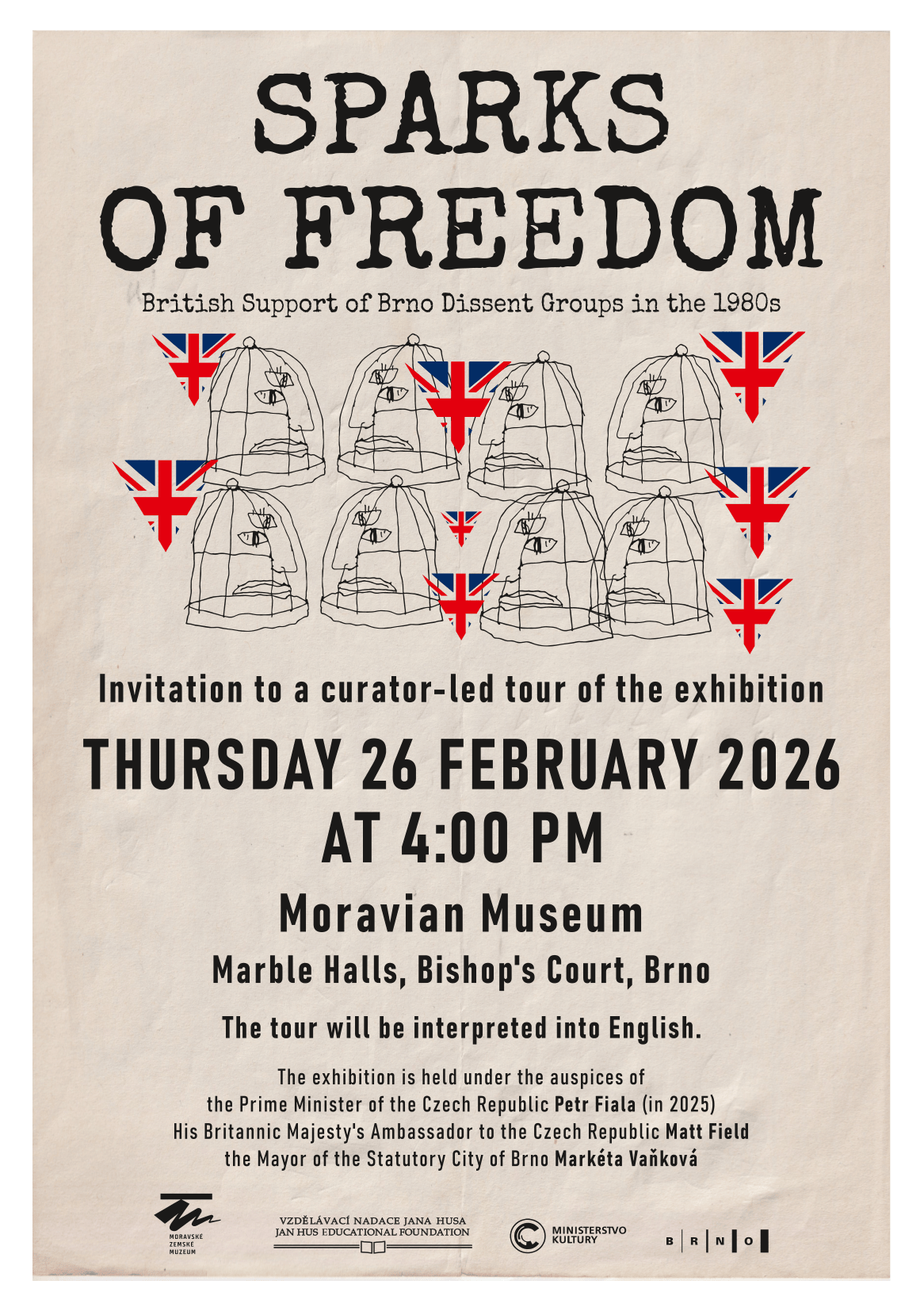Výstavu Paprsky svobody Britská podpora brněnského disentu v 80. letech 20. století navštívili také autoři podcastu Přepište dějiny, který se věnuje tématům dějin ve veřejném prostoru, politiky, médií a nepřebernému množství témat souvisejících.