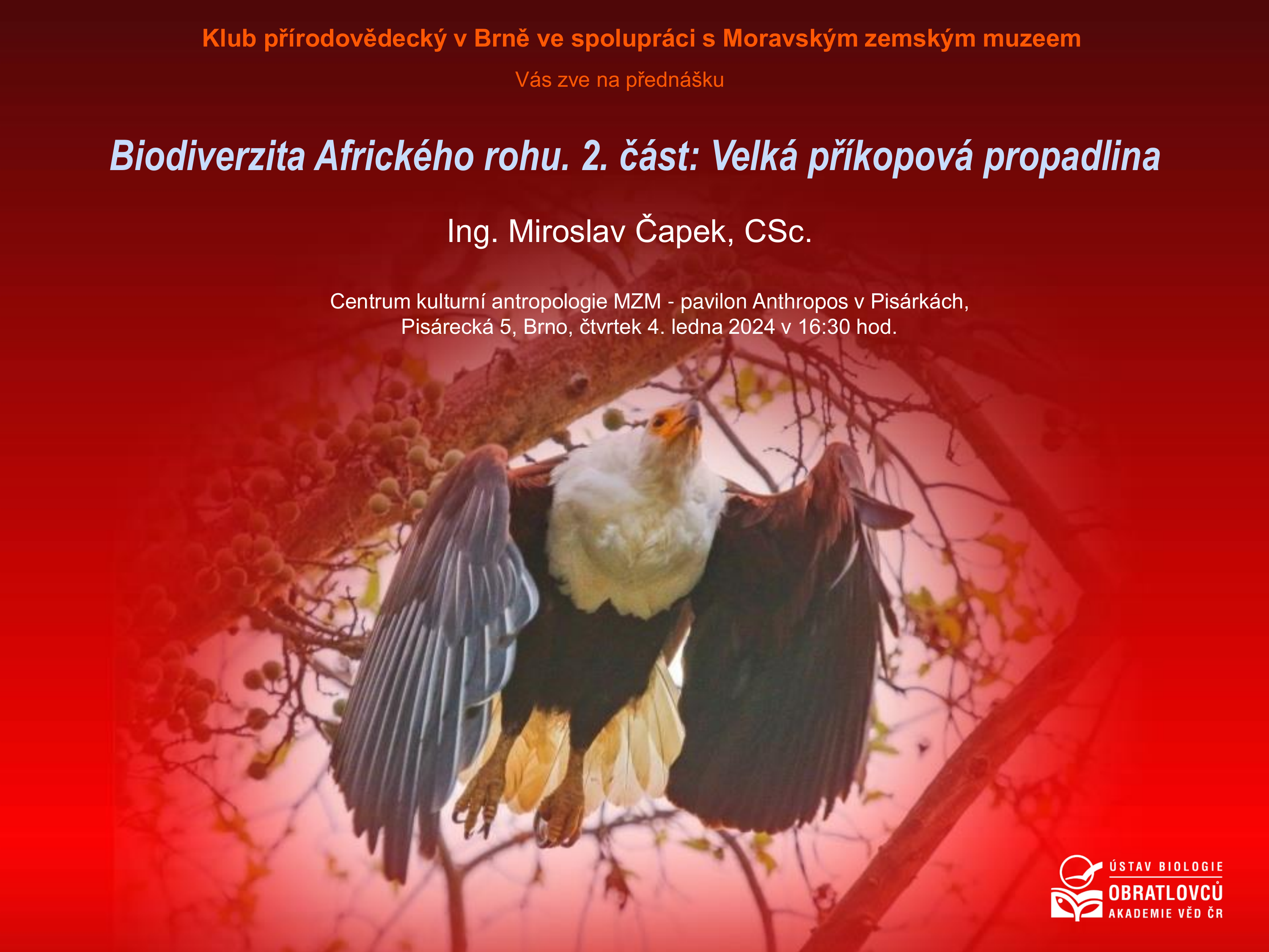 Africký roh představuje pro přírodovědce jednu z nejvíce fascinujících a biologicky nejrozmanitějších oblastí kontinentu, jakož i celé Afrotropické oblasti. Po první části přednášky zaměřené na diverzitu obratlovců Etiopské vysočiny, patřící mezi nejdrsnější oblasti Afriky, se v druhé části přesuneme do Velké příkopové propadliny, která rozděluje tento rozsáhlý horský masiv a zároveň je jednou z geologicky nejaktivnějších míst naší planety. Mocné tektonické síly zde trhají africký kontinent vedví. V různých prostředích se zde vyskytuje unikátní flóra a fauna. Podíváme se do severní části pohoří Bale a do několika míst Velké příkopové propadliny, např. do lokality Wondo Genet, do oblastí kolem jezer Awasa, Langano a Ziway aj. Autorovy originální snímky představí řadu druhů ptáků a savců včetně jedinečných endemitů, ale i druhů s většími areály rozšíření a také některé palearktické mezikontinentální migranty zimující v Africe.