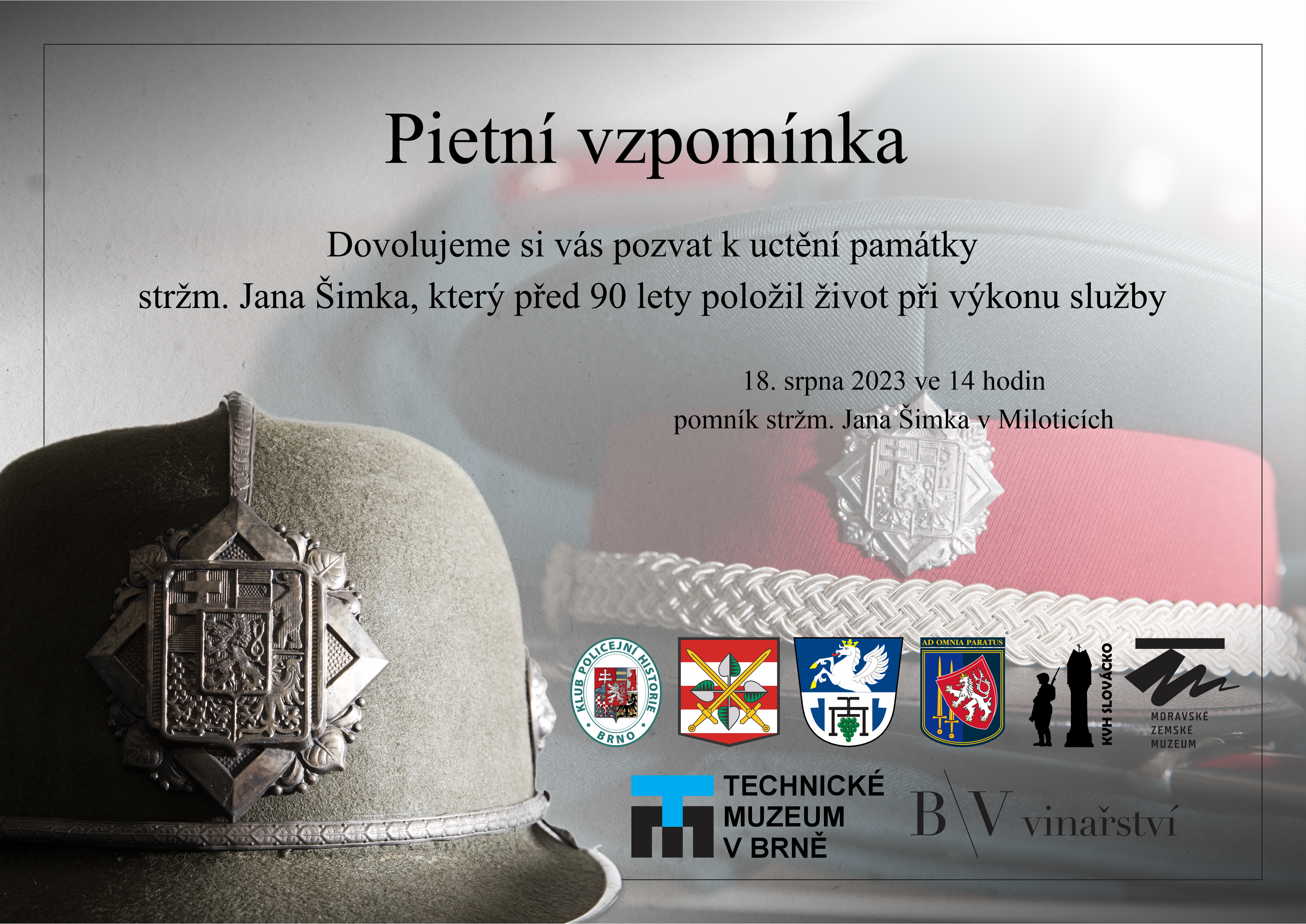 Srdečně zveme na pietní vzpomínku k uctění památky četnických strážmistrů Jana Šimka a Antonína Čudovského, kteří položili životy ve službě před 90 lety při zadržení nebezpečného vraha. Příběhy obou zastřelených četníků ve svém projevu připomene historik Moravského zemského muzea Mgr. Lukáš Lexa. Pietní vzpomínka se uskuteční v pátek 18. srpna 2023 ve 14 hodin u pomníku strážmistra Šimka v Miloticích (na okraji obce před areálem BV vinařství a.s.).
