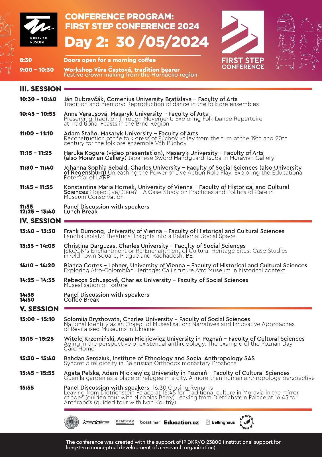 on behalf of the Ethnographic Institute of the Moravian Museum, we would like to invite you to participate in the first year of the international conference called First Step Conference. We want to give university students in the fields of ethnology and anthropology the opportunity to share the results of their research work in the form of a short paper, on 29-30 May 2024 in the Dietrichstein Palace. The conference is not focused on a specific topic and welcomes students of bachelor's, master's and doctoral degrees. The best studies will be selected and published in the scientific journal Folia Ethnographica in 2025.
