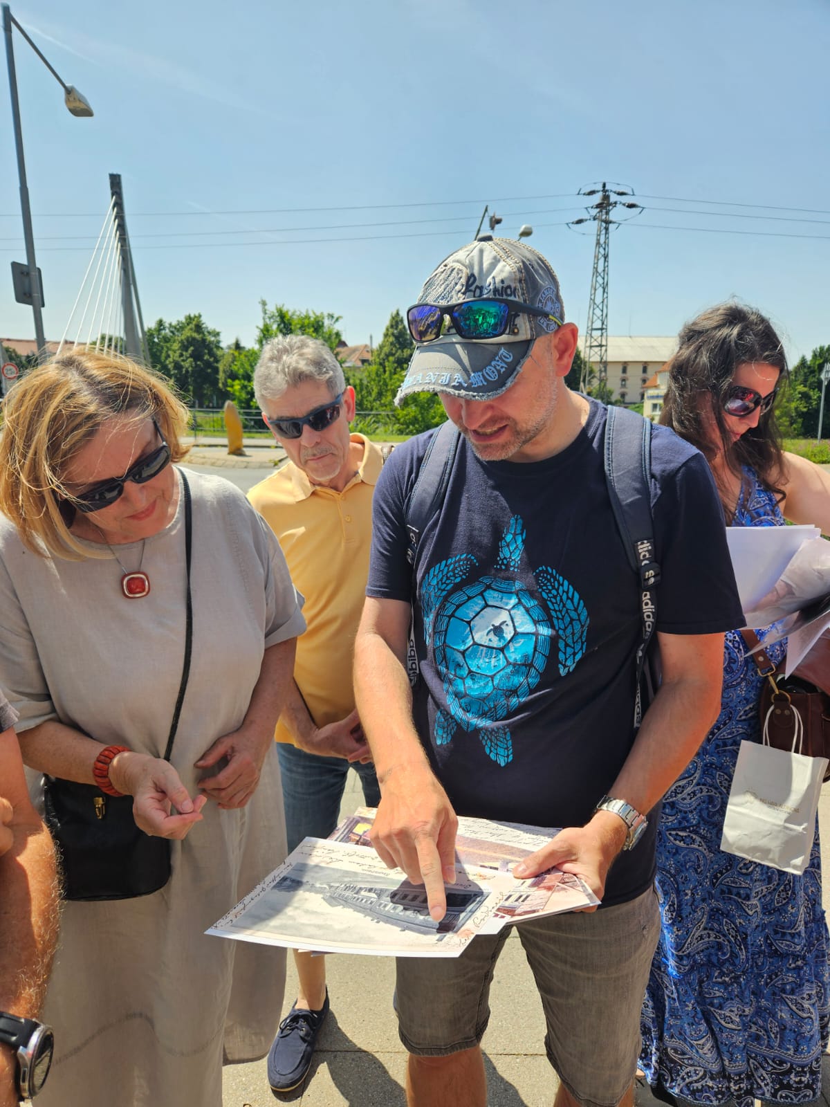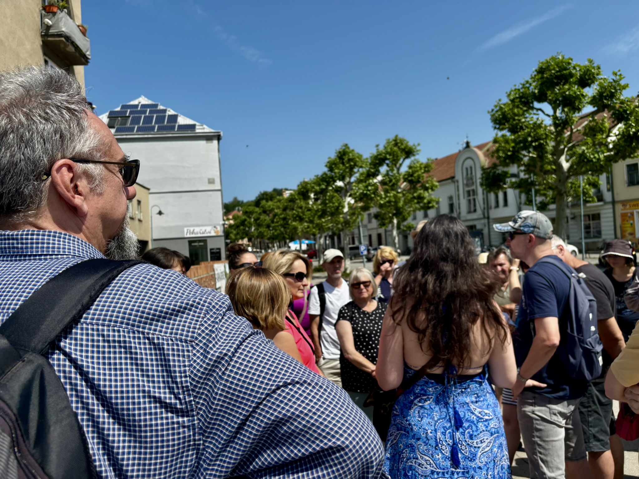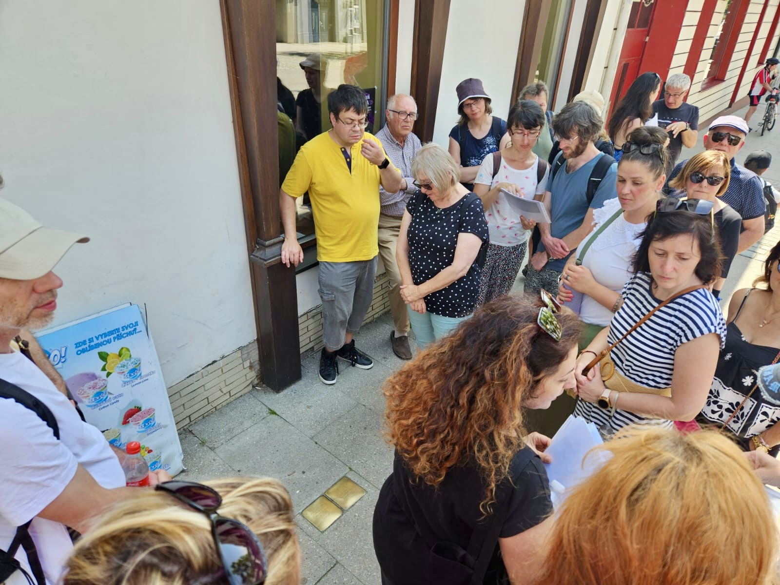 Prohlídkou provázely Mgr. Dana Vedra a Mgr. Táňa Klementová. Ta se ve svém dlouhodobém výzkumu se věnuje osudům židovských obyvatel Moravy v době holocaustu, pátrá po jednotlivých osobnostech a rodinách. U jednotlivých pomníčků byly připomenuty rodiny Burianových, Kosinových, Krausových, Steinerových, Stiassných, Otto Fischla, Elišky Morgensternové a dalších. Komentář byl provázán historickým kontextem perzekucí osob označených tzv. Norimberskými zákony za židy a židovské míšence. Tato skupina byla v Židlochovicích zvlášť hojněji zastoupená, proto se výklad zaměřil i na tyto perzekuované obyvatele.