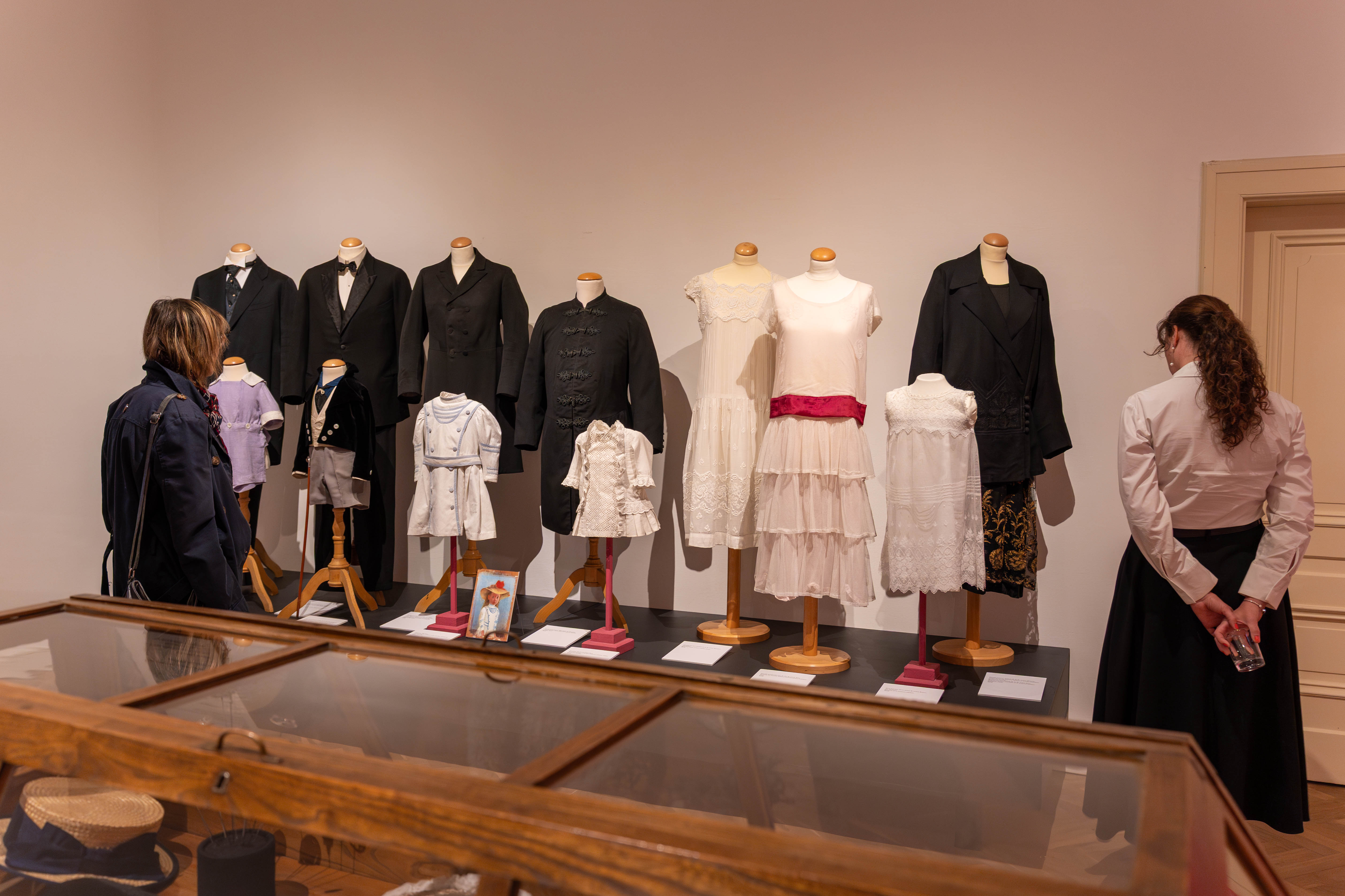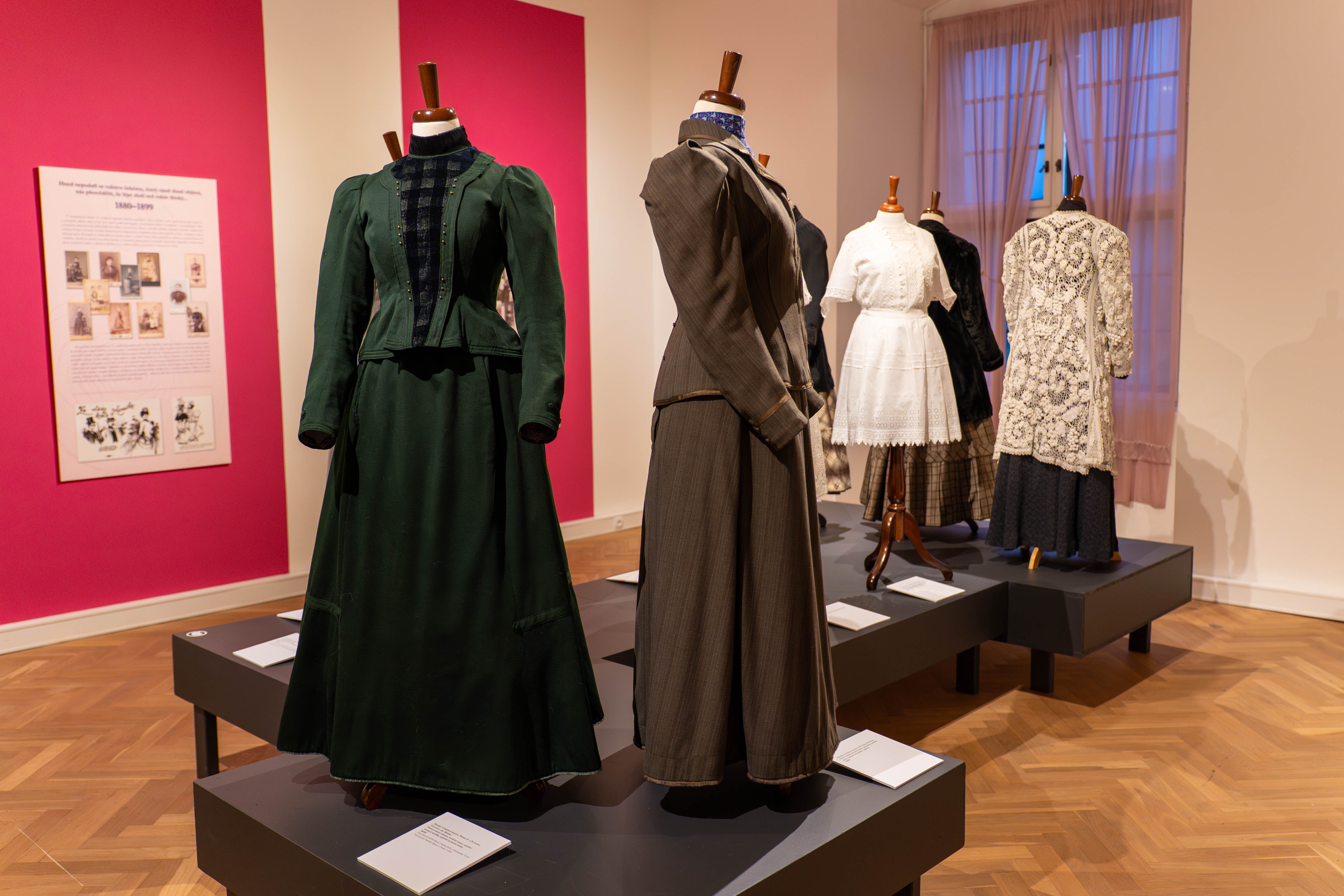 Výstava prezentuje oblečení z přelomu 19. a 20. století. Můžeme na ní vidět šaty s tzv. turnýrou, nebo šunkovými rukávy, či oděvy s takzvanou husí hrudí ze začátku 20. století, ale i přešívané komplety z období první světové války a v neposlední řadě šaty se sníženým pasem typické pro 20. léta 20. století. Konvolut 27 dámských úborů doplňují pánské obleky. Opomenuty nezůstaly ani oděvy dětí. Samostatně je pak k vidění spodní prádlo, které kromě hygienické funkce, bylo nezbytné pro správné tvarování linie svrchních šatů. Součástí výstavy jsou i desítky doplňků od obuvi, přes kabelky, knoflíky, jehlice a hřebeny do vlasů, až po klobouky.