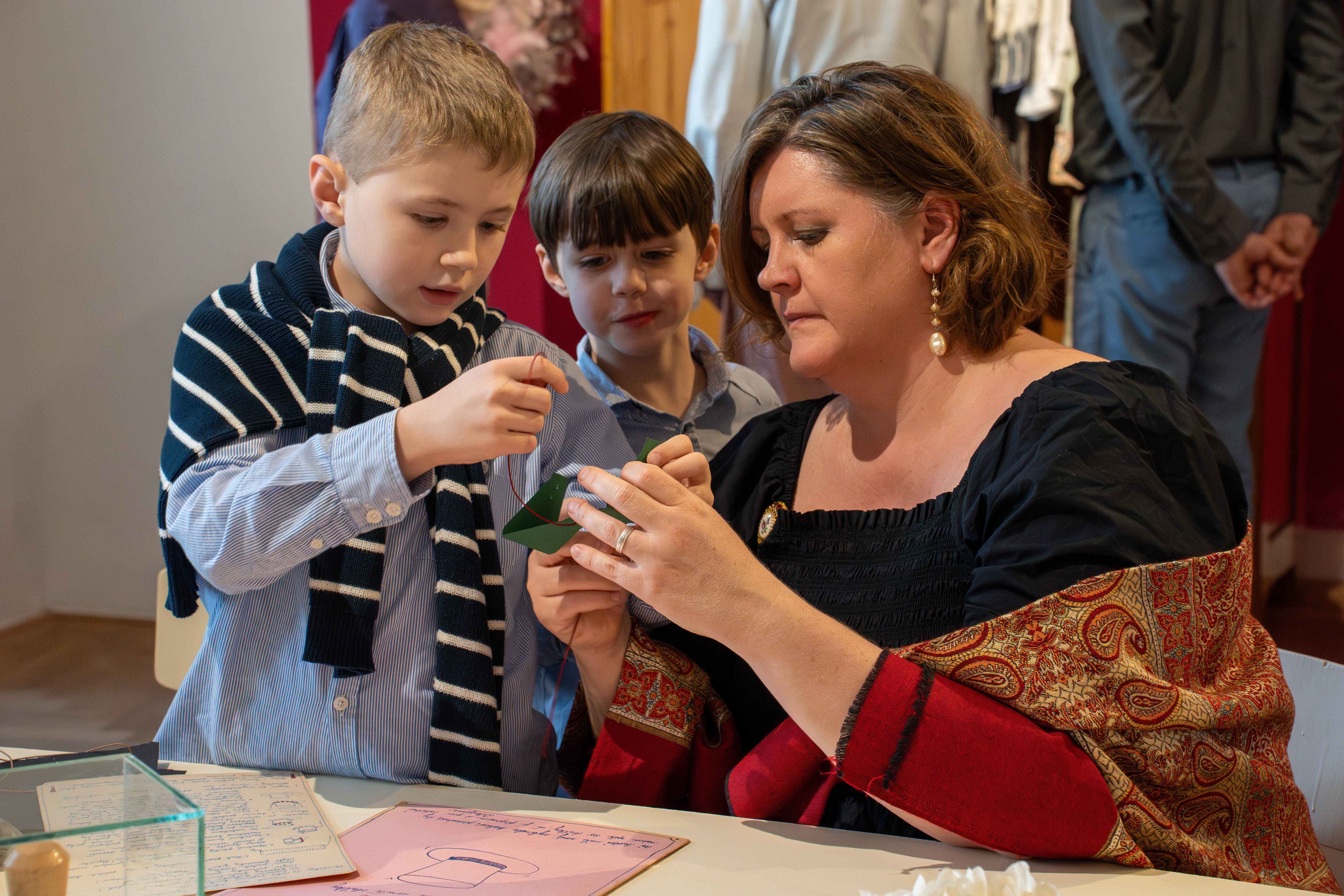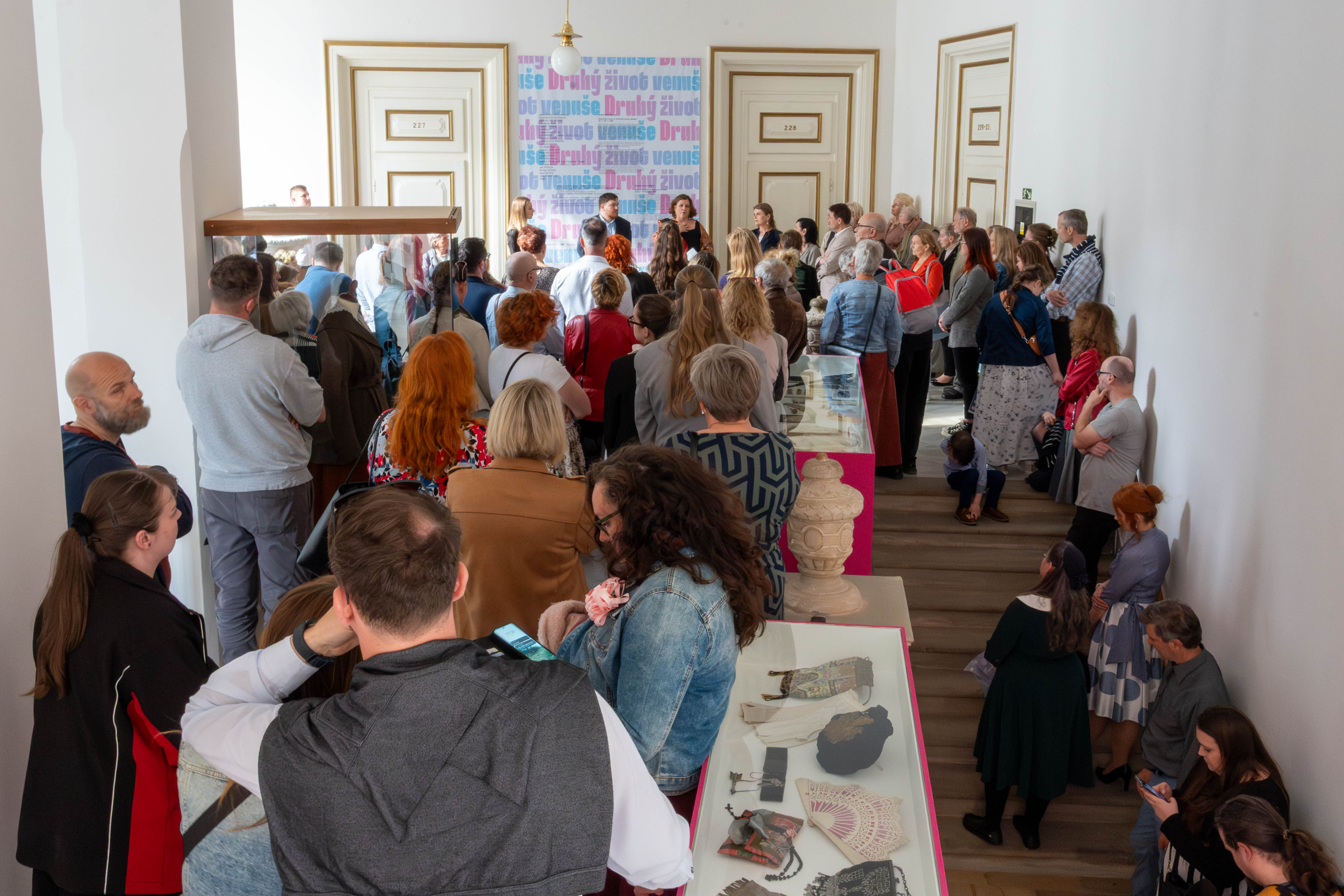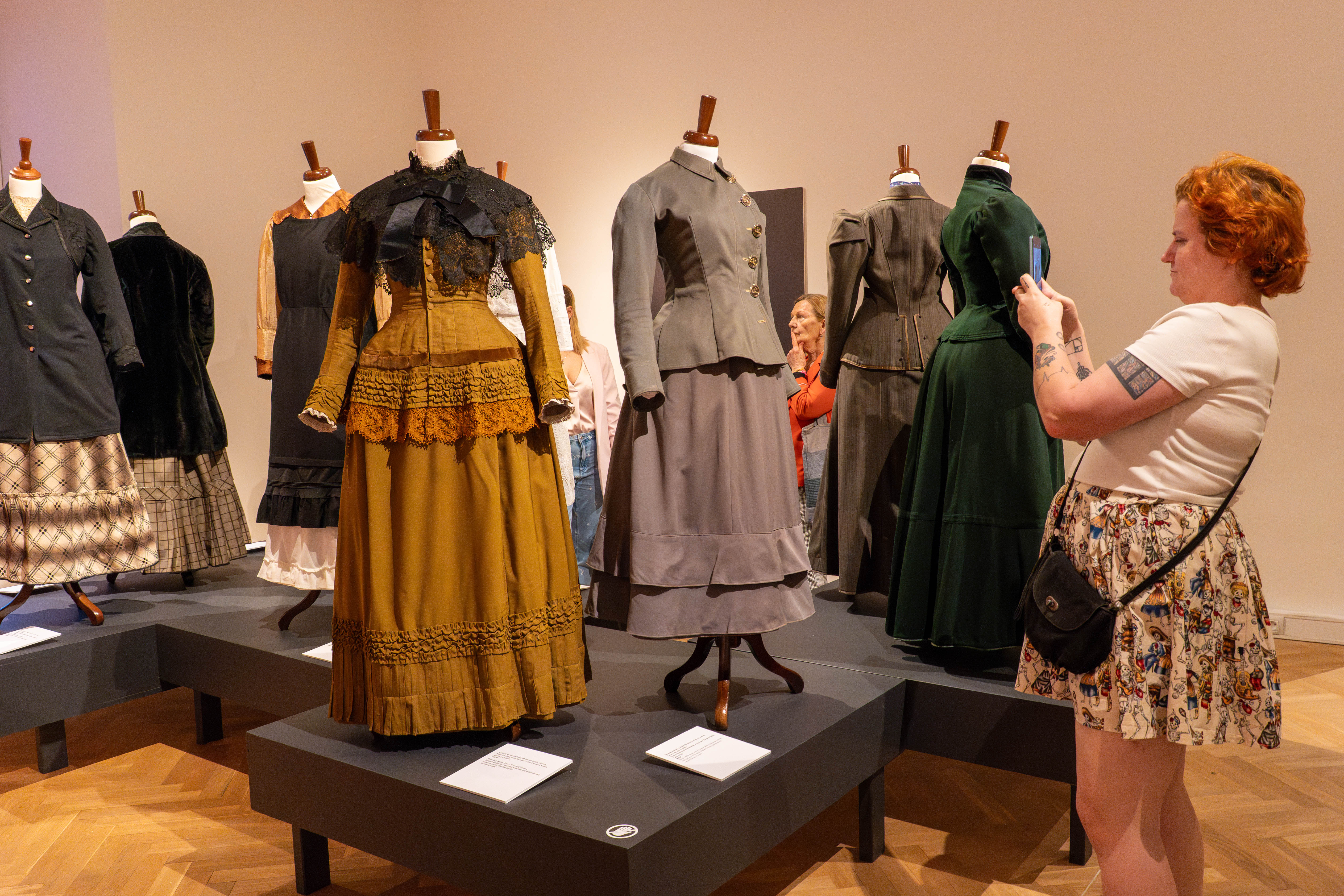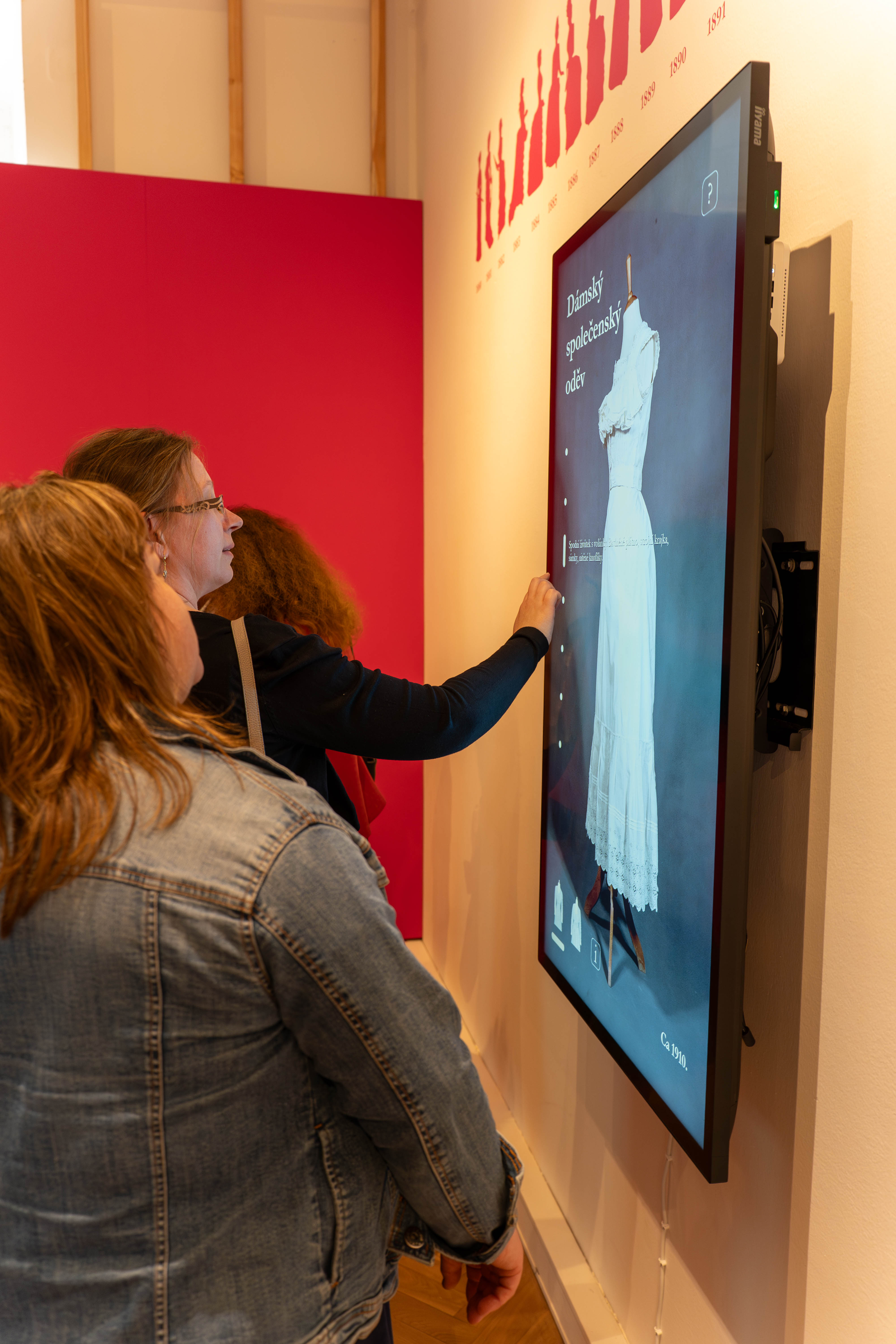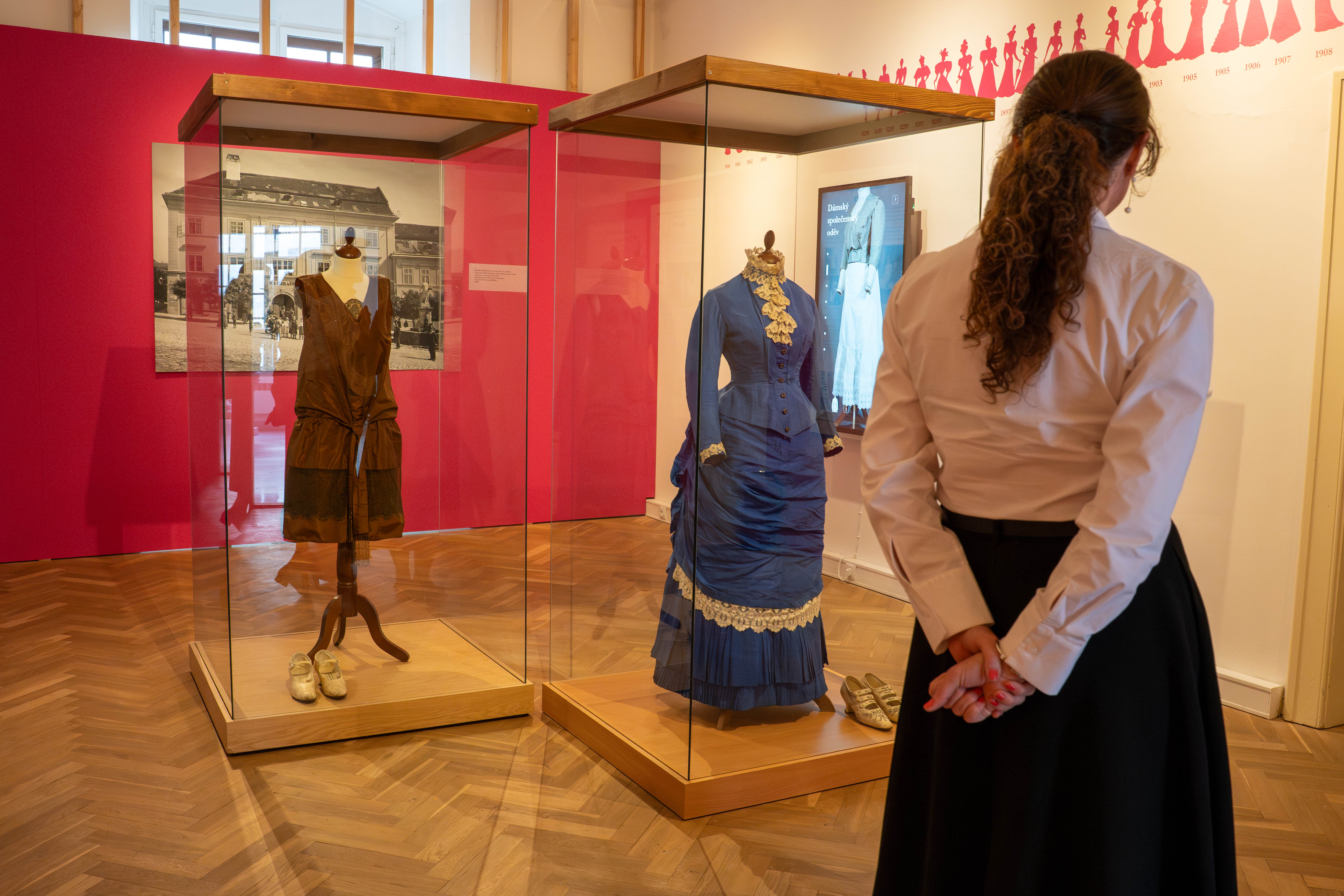 Ve výstavě jsou nainstalovány interaktivní obrazovky, kde si mohou návštěvníci vyzkoušet postupné oblékání dámských společenských šatů, prolistovat několik desítek fotografií i dobových anekdot zaměřených na módu. V orientaci mezi textilními materiály i pojmy užitými v textech ve výstavě pomůže slovníček a pro hravé návštěvníky je připraven dámský budoár s modely určenými k vyzkoušení s možností vyfotografování.