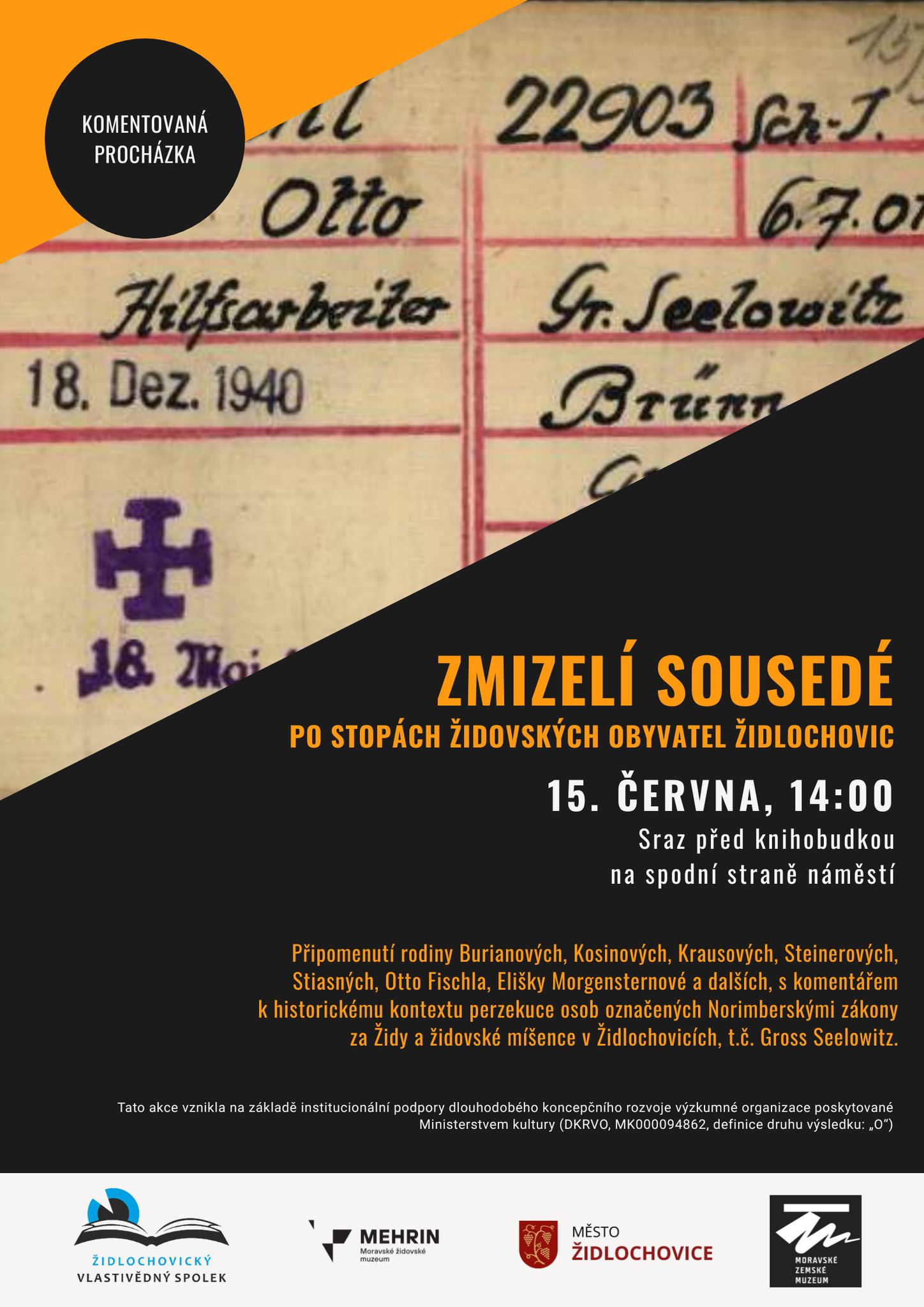 Židlochovický vlastivědný spolek, Mehrin a Moravské zemské muzeum pořádá komentovanou procházku s historičkami Mgr. Danou Vedra a Mgr. Táňou Klementovou. Pozastavíme se nad jednotlivými tzv. kameny zmizelých (Stolpersteiny) připomínající židovské obyvatele Židlochovic. Připomeneme si rodiny Burianových, Kosinových, Krausových, Steinerových, Stiassných, Otto Fischla, Elišky Morgensternové a dalších. Komentář bude provázán historickým kontextem perzekucí osob označených Norimberskými zákony za Židy a židovské míšence v Židlochovicích, v době okupace Gross Seelowitz.