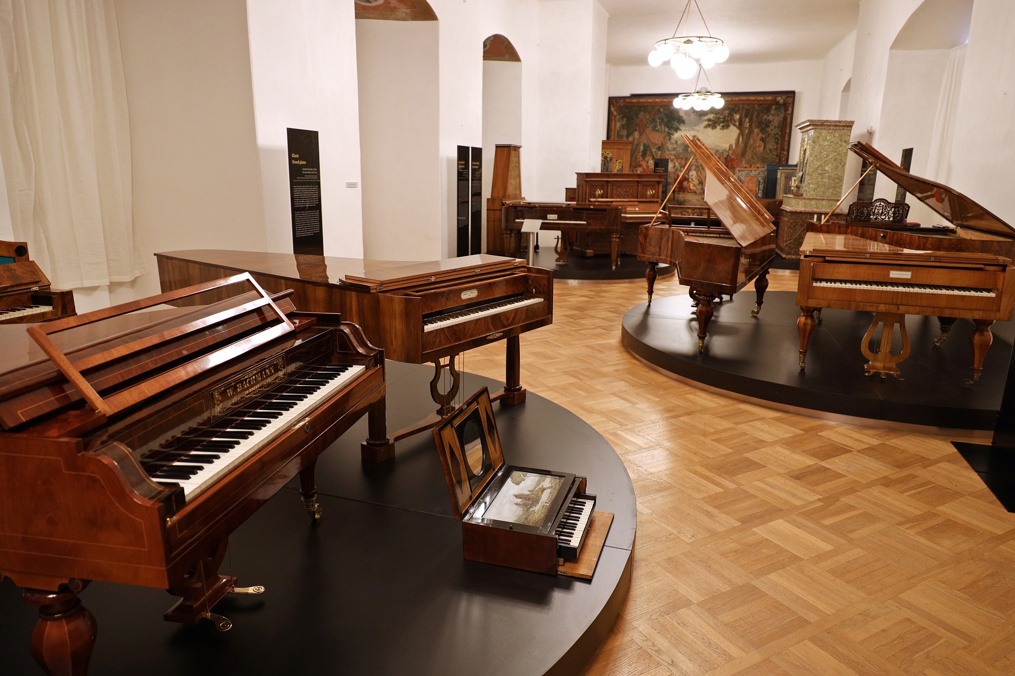 K vidění jsou klavichordy, virginal, rozmanité druhy klavírů i malé typy varhan. Expozici doplňuje vzácná barokní tapiserie s hudebními motivy „Hostina bohů na Olympu“.