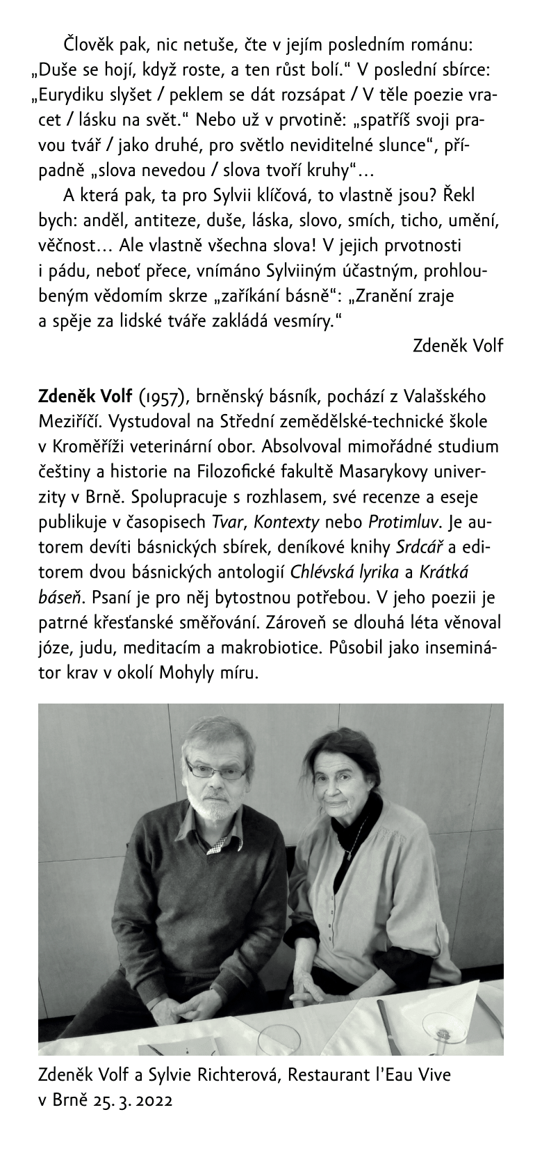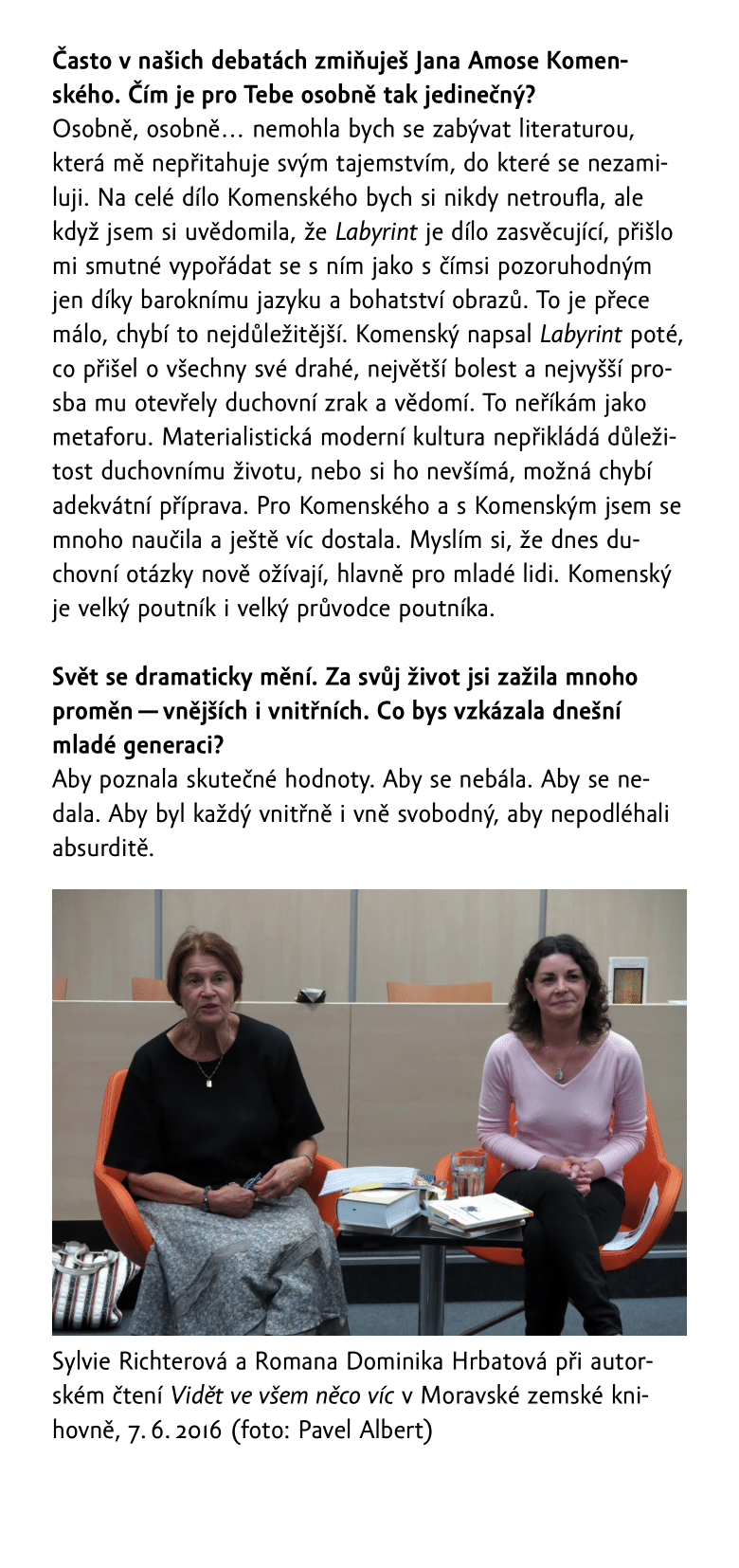 Milé čtenářky, milí čtenáři, dostalo se mi vzácné příležitosti připravit pro vás další číslo našeho bulletinu. Na svých životních poutích každý potkáváme místa, situace a osobnosti, které nás inspirují, proměňují, formují. Pro mne osobně jedno z takových bylo setkání se spisovatelkou, básnířkou, esejistkou, překladatelkou a profesorkou bohemistiky Sylvií Richterovou, a to v roce 2016 při přípravě výstavy a doprovodného katalogu s názvem Proměny cesty. S úžasem jsem se nořila do jednotlivých textů, sledovala, jak její dílo i osobnost vnímají její přátelé a kolegové. Sylvie mne přitahovala svým životním optimismem, smyslem pro humor a pro krásu, nadhledem — plynoucím snad ze zkušeností ze života ve svobodné Itálii i ze schopnosti domluvit se několika jazyky, bouráním předsudků a stereotypů, silným morálním kompasem. Více zde...