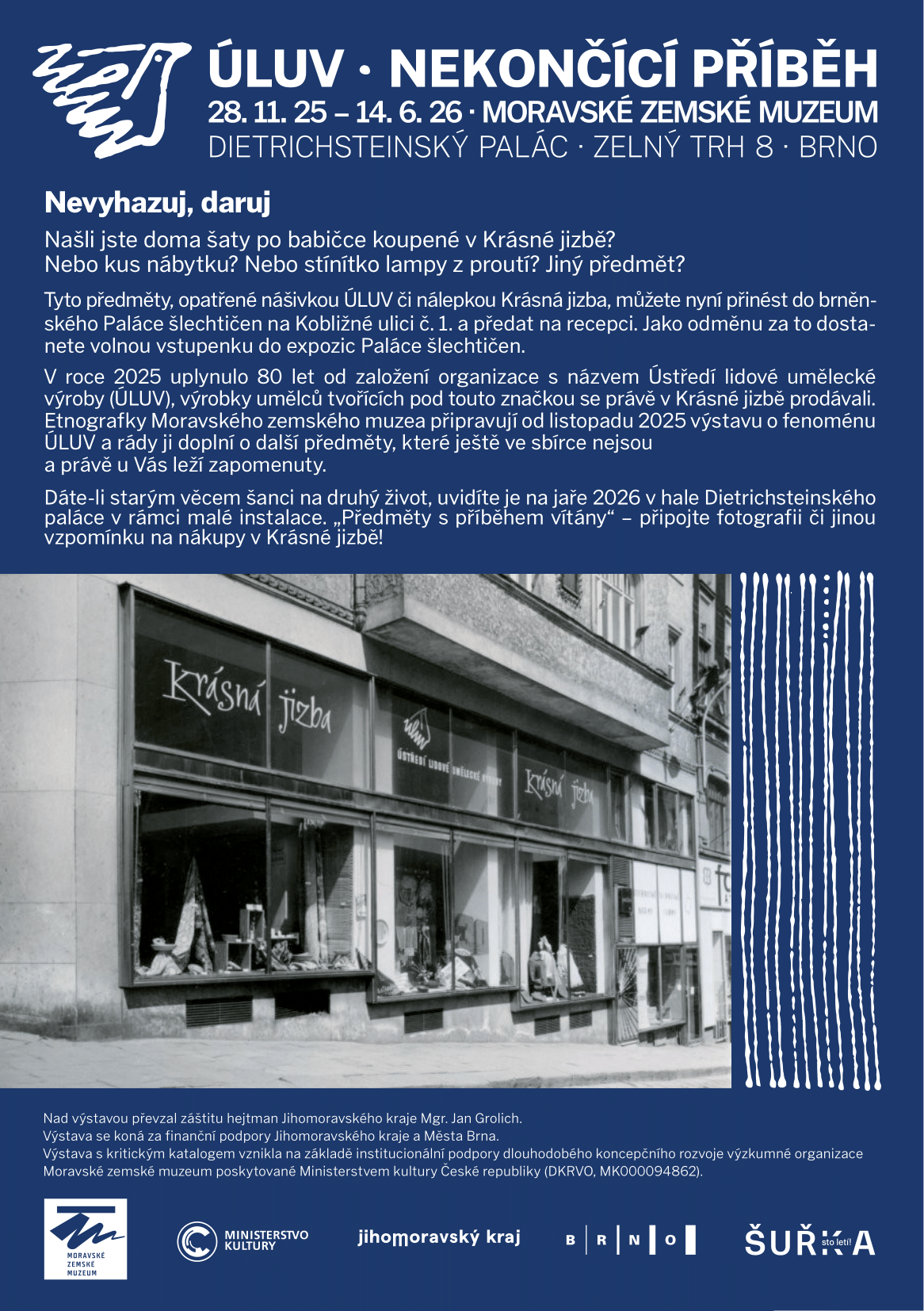 Zkratka ÚLUV tvořila značku organizace Ústředí lidové umělecké výroby podílející se ve druhé polovině 20. století na formování životního stylu československé společnosti především v oblasti oděvní a bytové kultury. Etnografický ústav MZM byl jediným národopisným muzeem v českých zemích, které soustavně mohlo sledovat vývoj a zároveň shromažďovat strukturální změny lidové umělecké výroby. V letech 1973 - 1993 dokumentoval ústav činnost ÚLUV formou nákupů oceněných výrobků z různých soutěží i z běžné nabídky. Vzhledem k zániku ÚLUV byla v Brně shromážděna jedinečná kolekce zachycující stav soudobé umělecké výroby inspirované tradicí. Výstava mapující muzejní sbírku ÚLUV nebyla dosud prezentována.