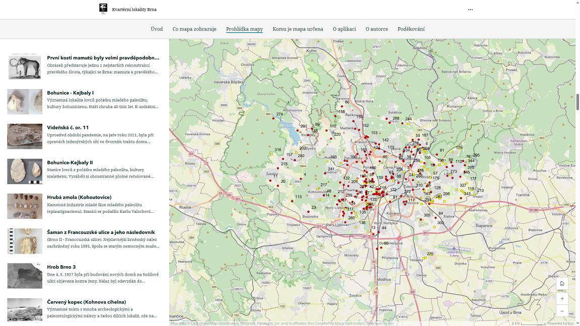 Mapová aplikace vychází z publikace Po stopách nejstaršího osídlení Brna autorky Zdeňky Nerudové (Moravské zemské muzeum, 2022). Formou virtuální prohlídky jsou zde prezentována nejzajímavější místa s archeologickými nálezy paleolitického stáří v Brně. Mnohé z nich jsou opatřeny dalšími doplňujícími informacemi.