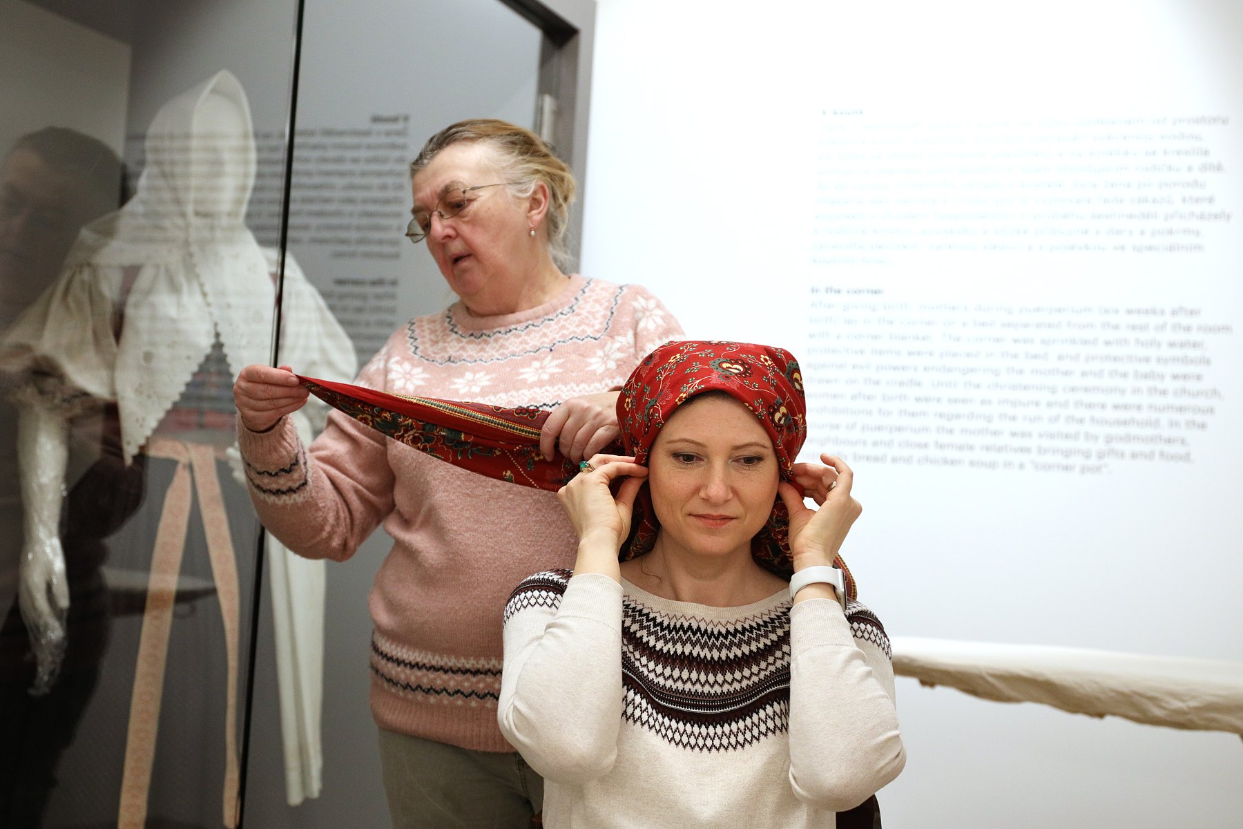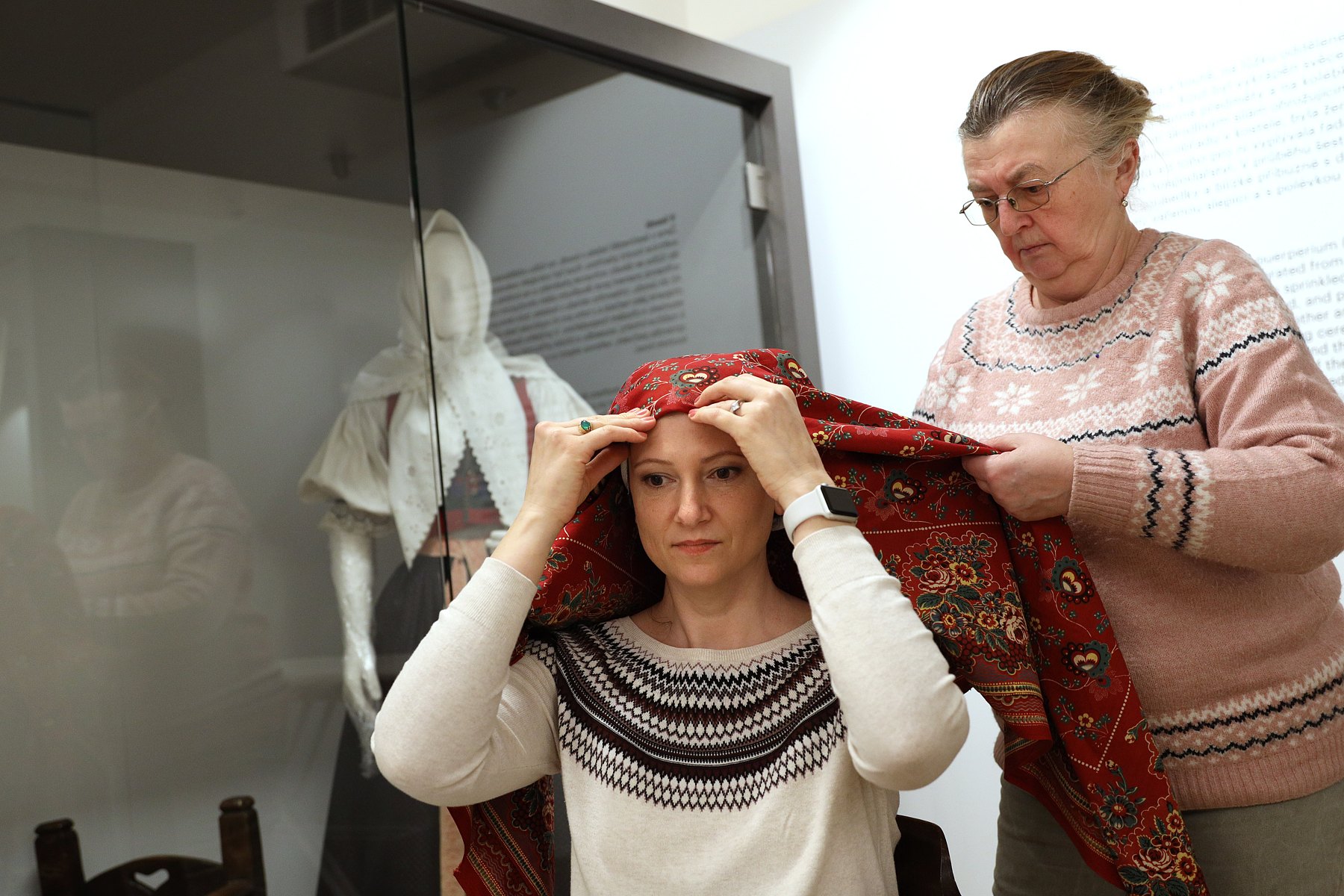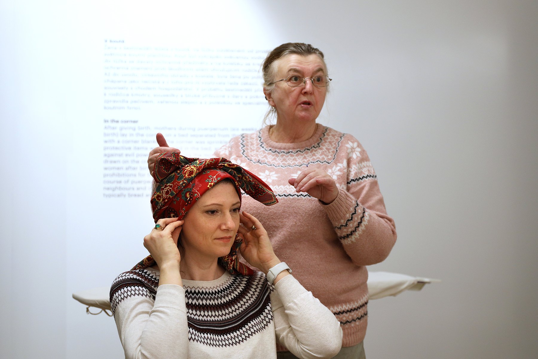 Vázání šátků k tradičnímu oděvu z Brněnska.