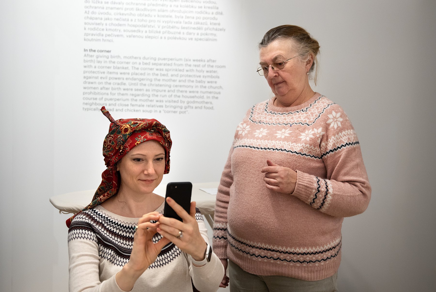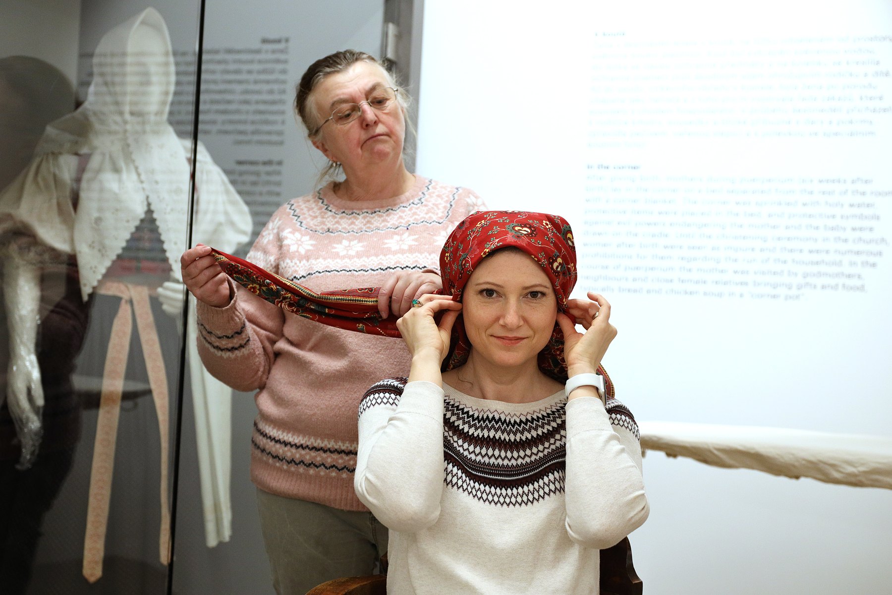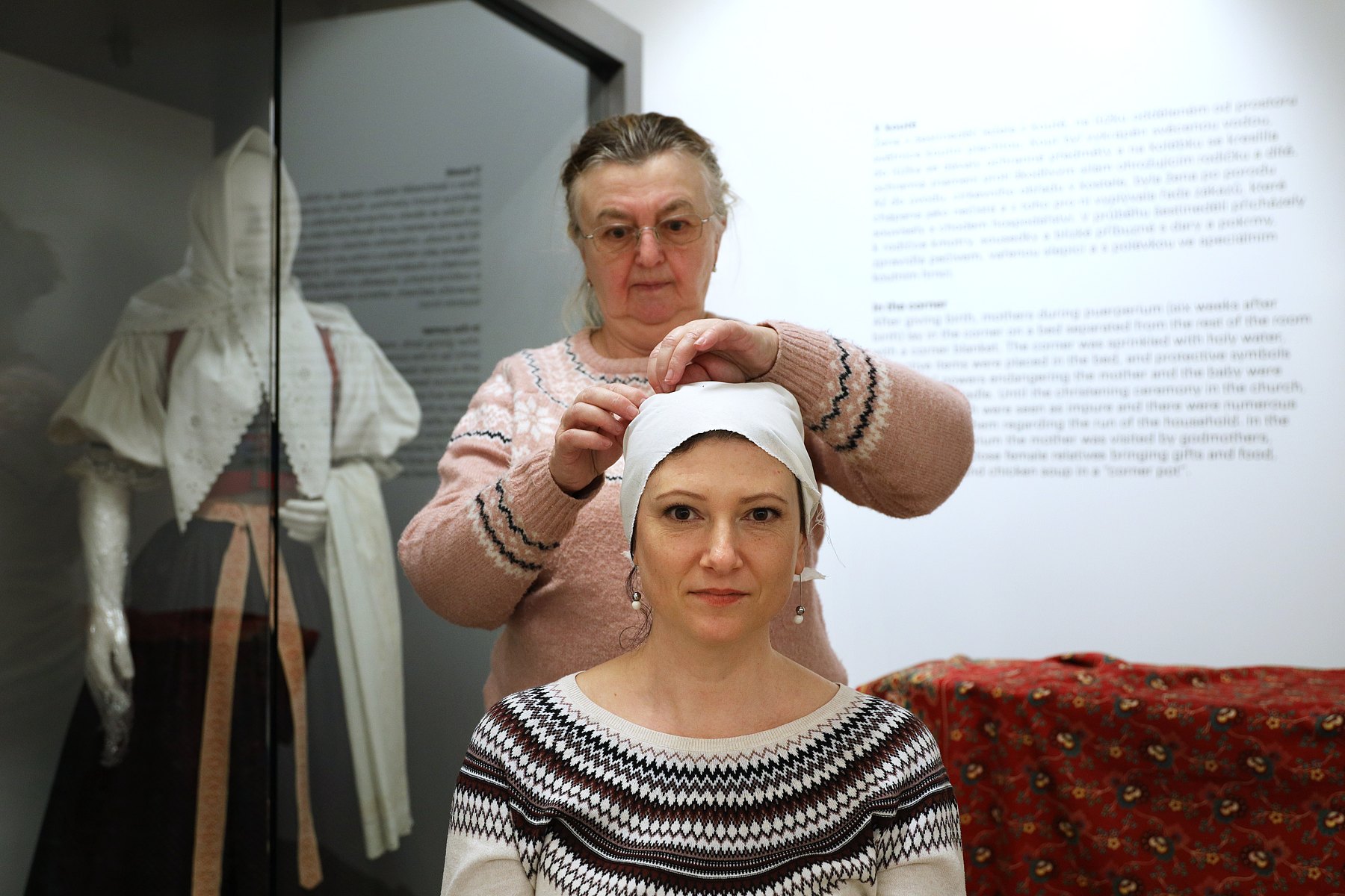 Vázání šátků k tradičnímu oděvu z Brněnska.