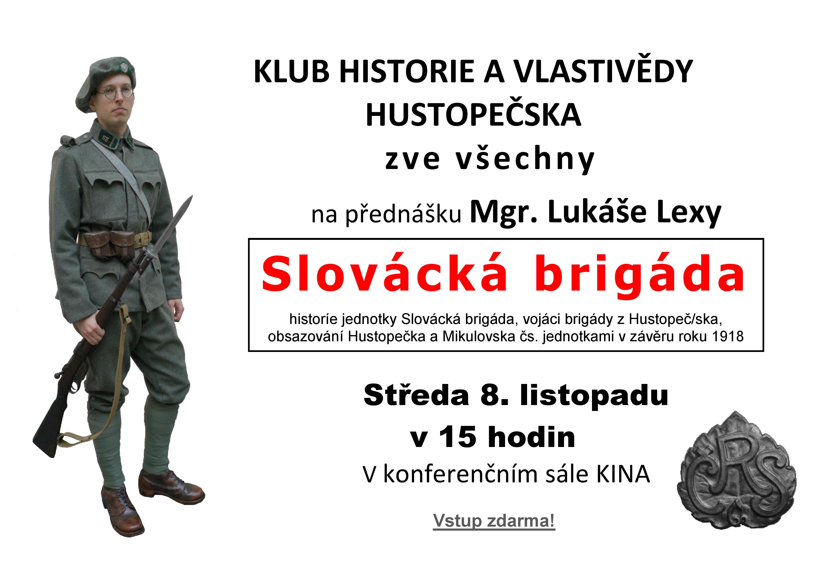 Ve středu 8. listopadu 2023 v 15 hodin se v konferenčním sále Kina v Hustopečích (Dukelské náměstí 15) uskuteční přednáška Mgr. Lukáše Lexy z Historického oddělení Moravského zemského muzea na téma Slovácká brigáda. Bude představena historie této dobrovolnické jednotky a okolnosti vojenského obsazování Hustopečska a Mikulovska v závěru roku 1918, v době složitého ustavování hranic vznikajícího Československa. Navíc budou představeny originální vojenské artefakty z výzbroje a výstroje Slovácké brigády a pozornost bude věnována i vojákům Slovácké brigády z Hustopeč a okolí.