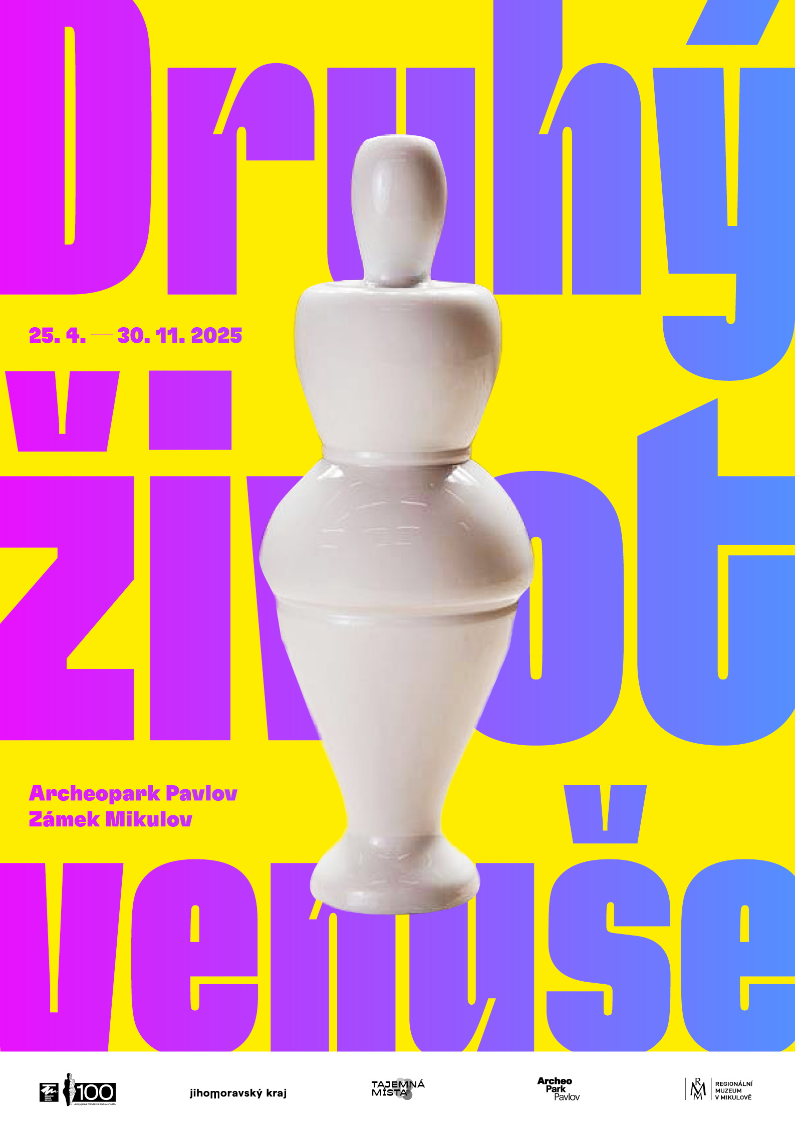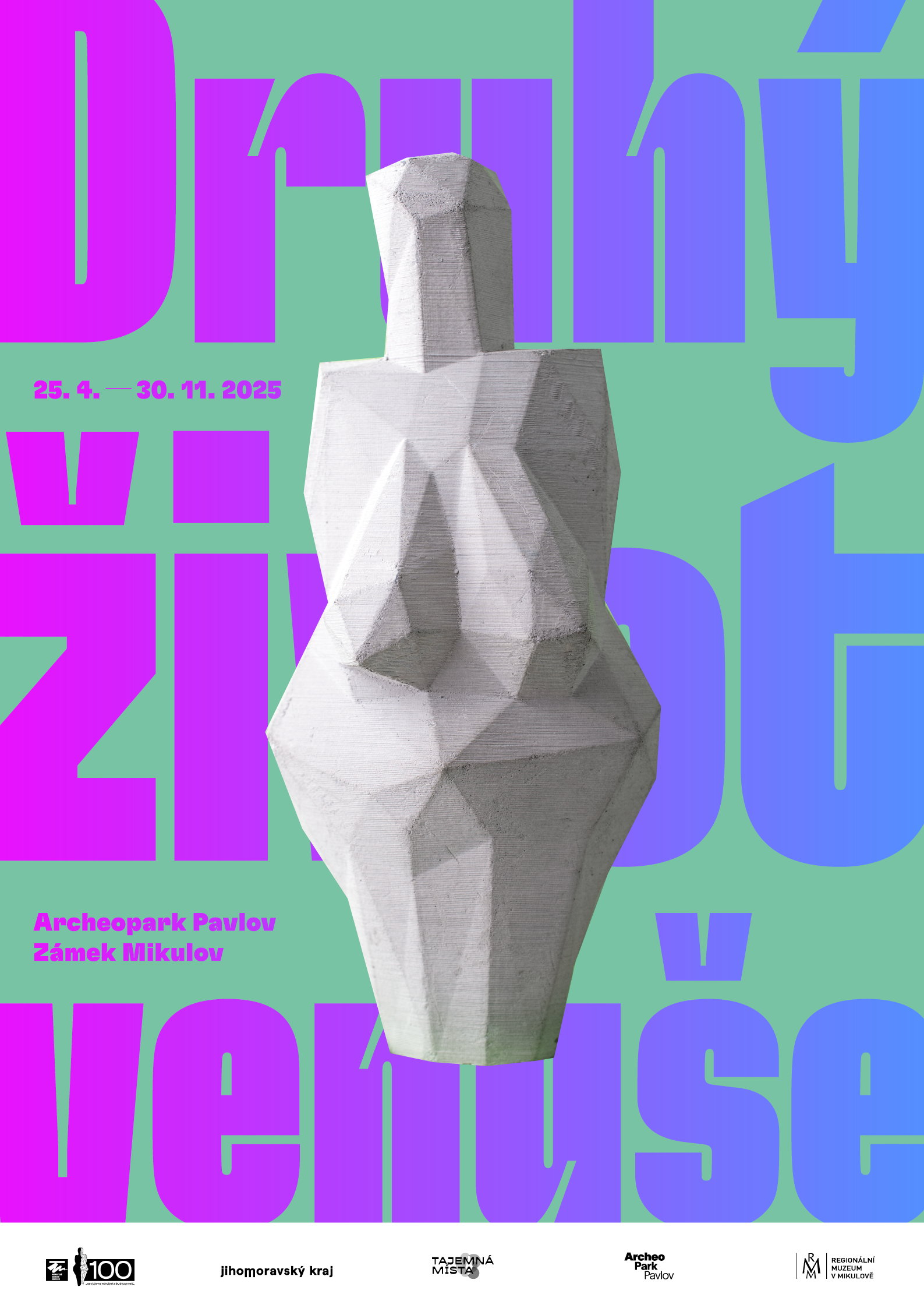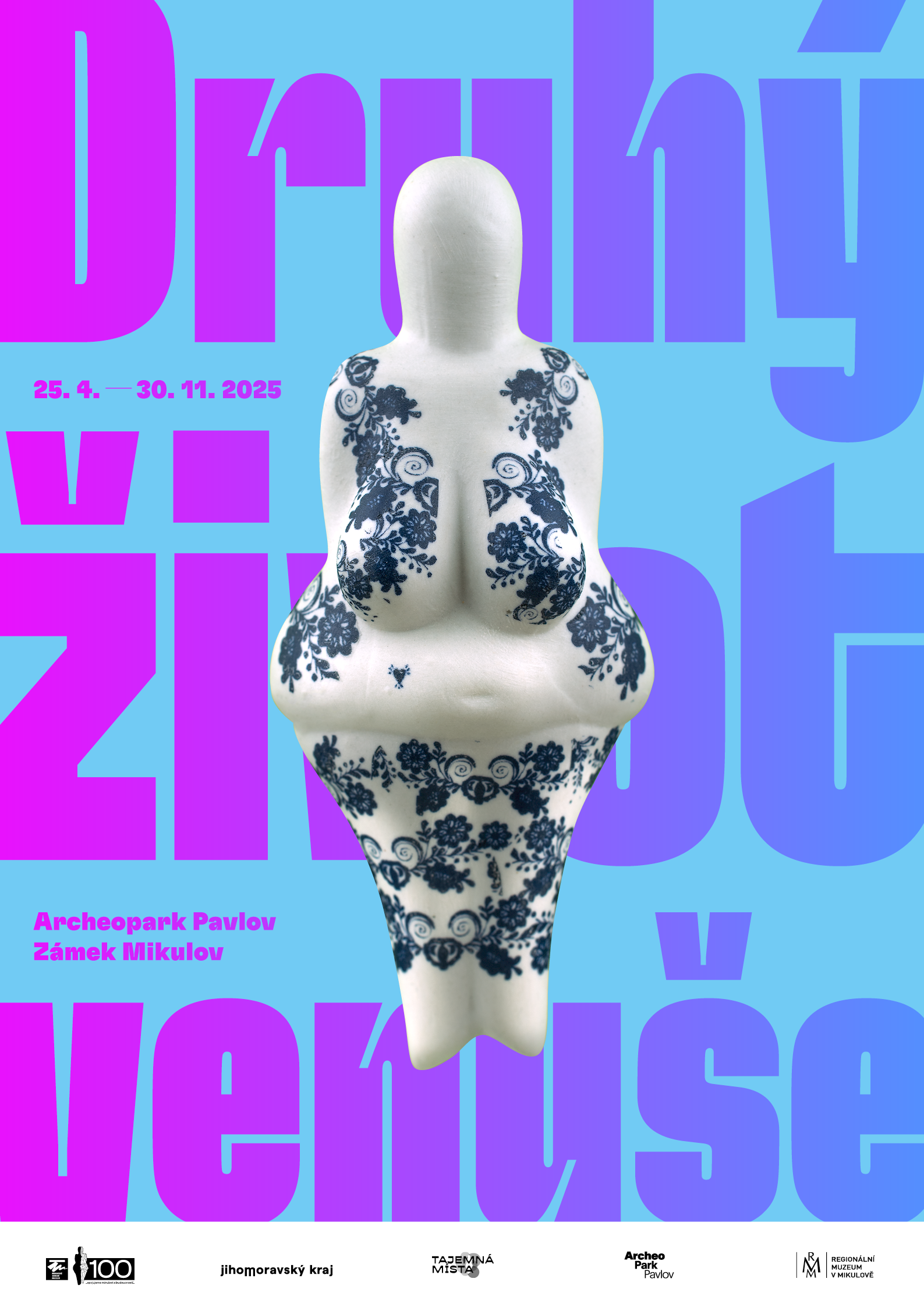 Výstava Druhý život venuše je rozdělena na dvě části. Její první část budete moci vidět v Archeoparku Pavlov, kde vás mimo jiné seznámíme s klasickým příběhem Věstonické venuše novou komiksovou formou a oživíme výstavu i dalšími interaktivními prvky. Druhou část výstavy, zaměřenou na umění a design, budete moci vidět na Zámku v Mikulově. Obě místa se návštěvníkům otevírají od 25. dubna do 30. listopadu 2025.