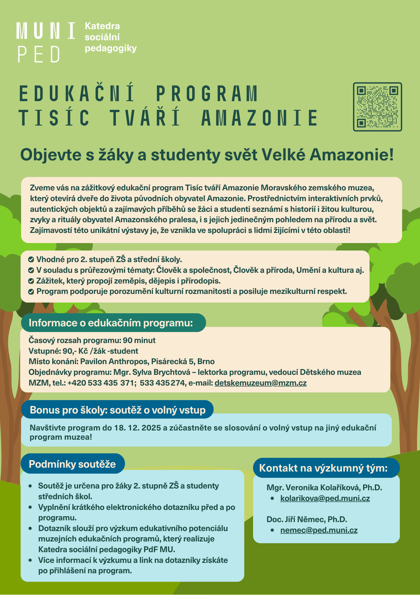 V programu se rovněž zaměříme na jedinečnost a zranitelnost Amazonie z geografického a environmentálního hlediska. Prozkoumáme přírodní rozmanitost této oblasti, která je domovem pro miliony rostlinných a živočišných druhů. Dotkneme se i tématu ohrožení, kterým Amazonie čelí v důsledku lidské činnosti, jako je odlesňování, těžba dřeva, požáry a změny klimatu. A budeme také diskutovat například o motivaci k ochraně a udržitelnosti životního prostředí.