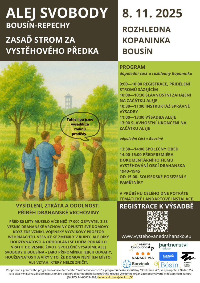 Zveme Vás na unikátní akci, kterou pořádá obec Bousín ve spolupráci s Nadací Partnerství a do které se zapojí i Moravské zemské muzeum. Letošní výsadba Aleje Svobody se odehraje na Drahanské vrchovině. V místě, kde se odehrály během druhé světové války evakuace obcí z důvodu rozšíření vojenského prostoru. Po válce se směli lidé navrátit do svých domovů, ale mnozí jej nalezli zcela zničený. Žádná z obcí neobnovila počet domů jako před válkou. Lidé po celá desetiletí si ve zdejším kraji připomínají zaniklé domy výsadbami stromů. Program bude pokračovat v Kulturním domě v Bousíně, kde od 14:00 bude promítán dokument Vystěhované Drahansko, který byl vytvořen na stejnojmennou výstavu. Poté následuje posezení s pamětníky.