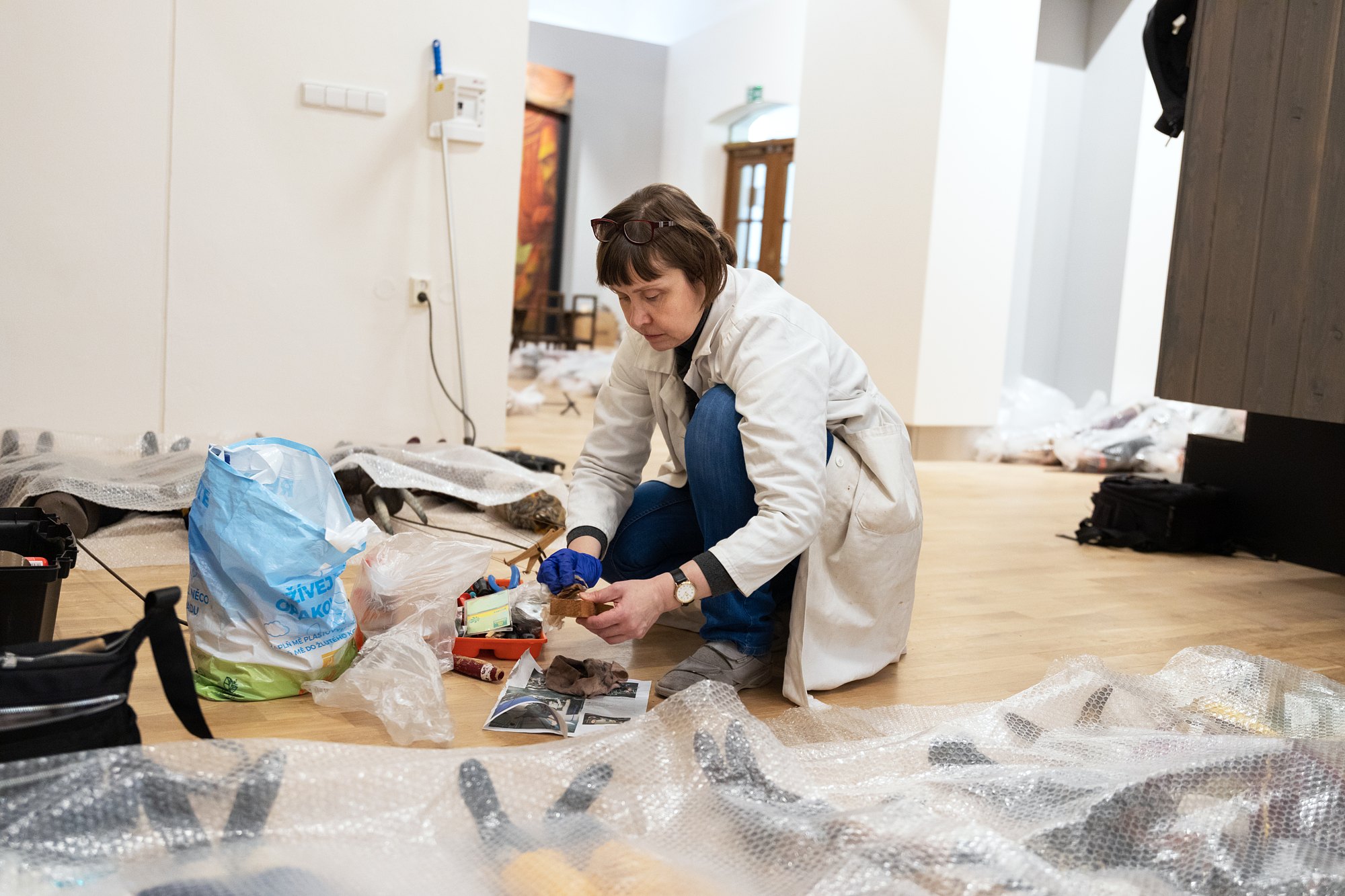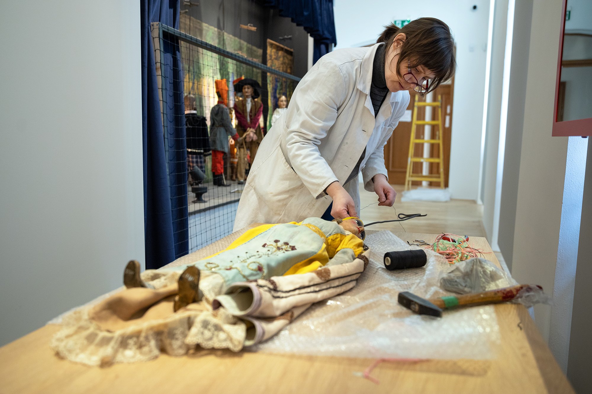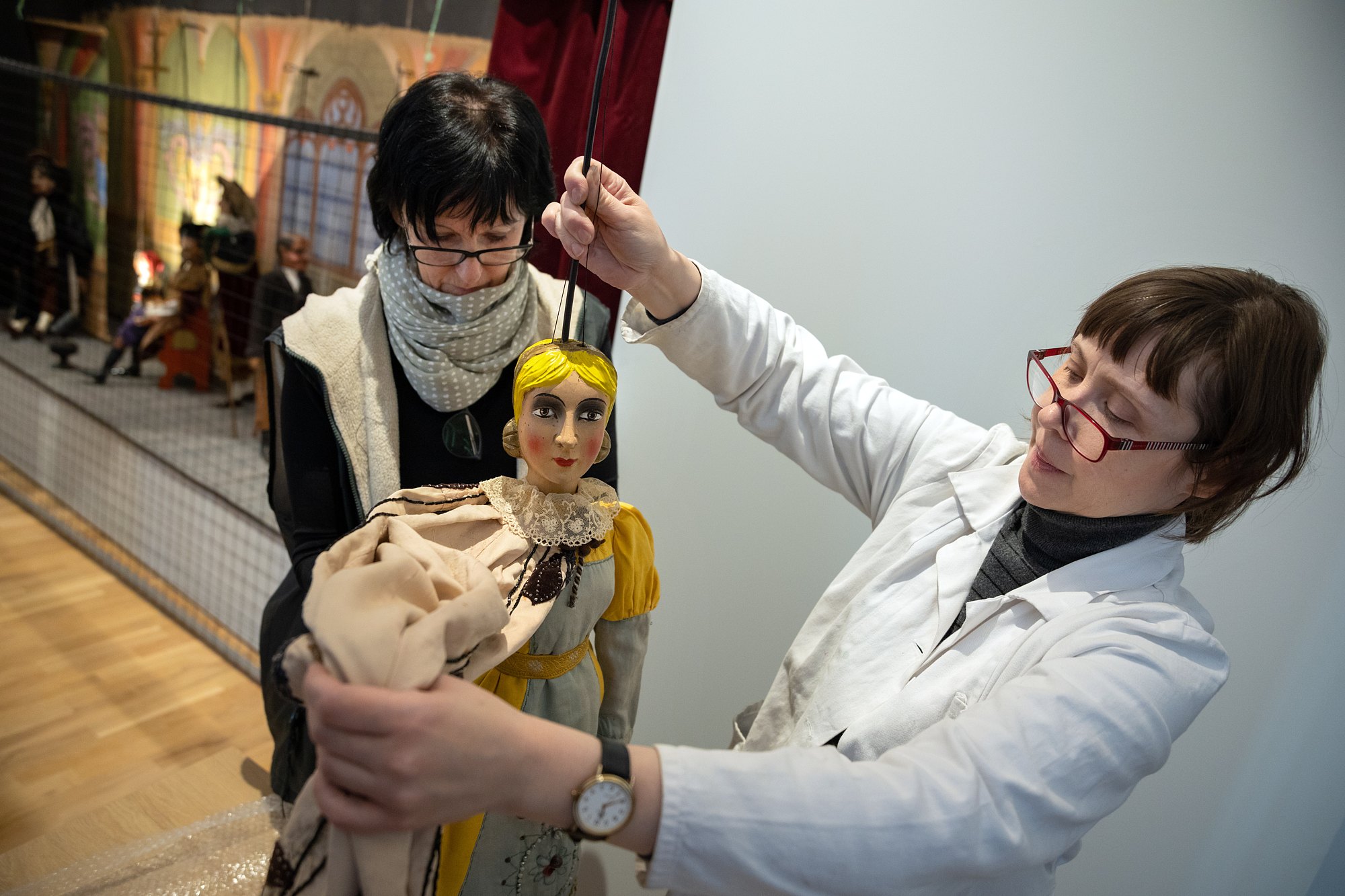Měli jsme velké štěstí. Expozici Loutkářské umění jsme totiž navštívili ve chvíli, kdy odborní pracovníci Oddělení dějin divadla MZM - PhDr. Jaroslav Blecha, Mgr. Olga Piperová Taušová a Helena Šedá instalovali marionety divadla Václava Kopeckého.