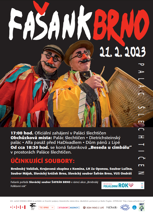 Ukázky fašankových zvyků: Alfa pasáž - před HaDivadlem, Dietrichsteinský palác, Dům pánů z Lipé a Palác šlechtičen.
