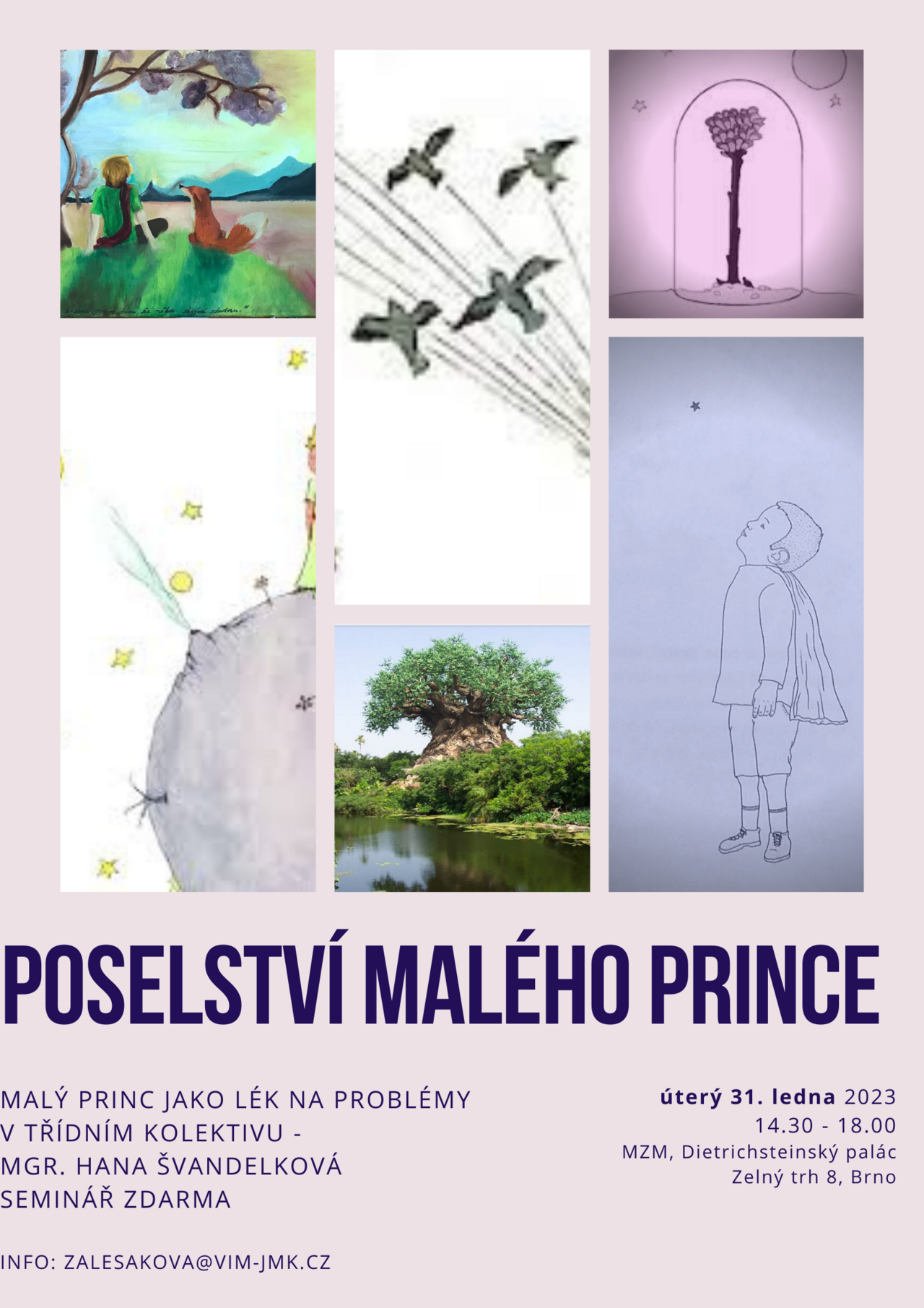 Ve 14:30 bude probíhat prohlídka výstavy Malý princ Elišky Podzimkové. V 15:00 bude následovat seminář v přednáškovém sále Dietrichsteinského paláce.
