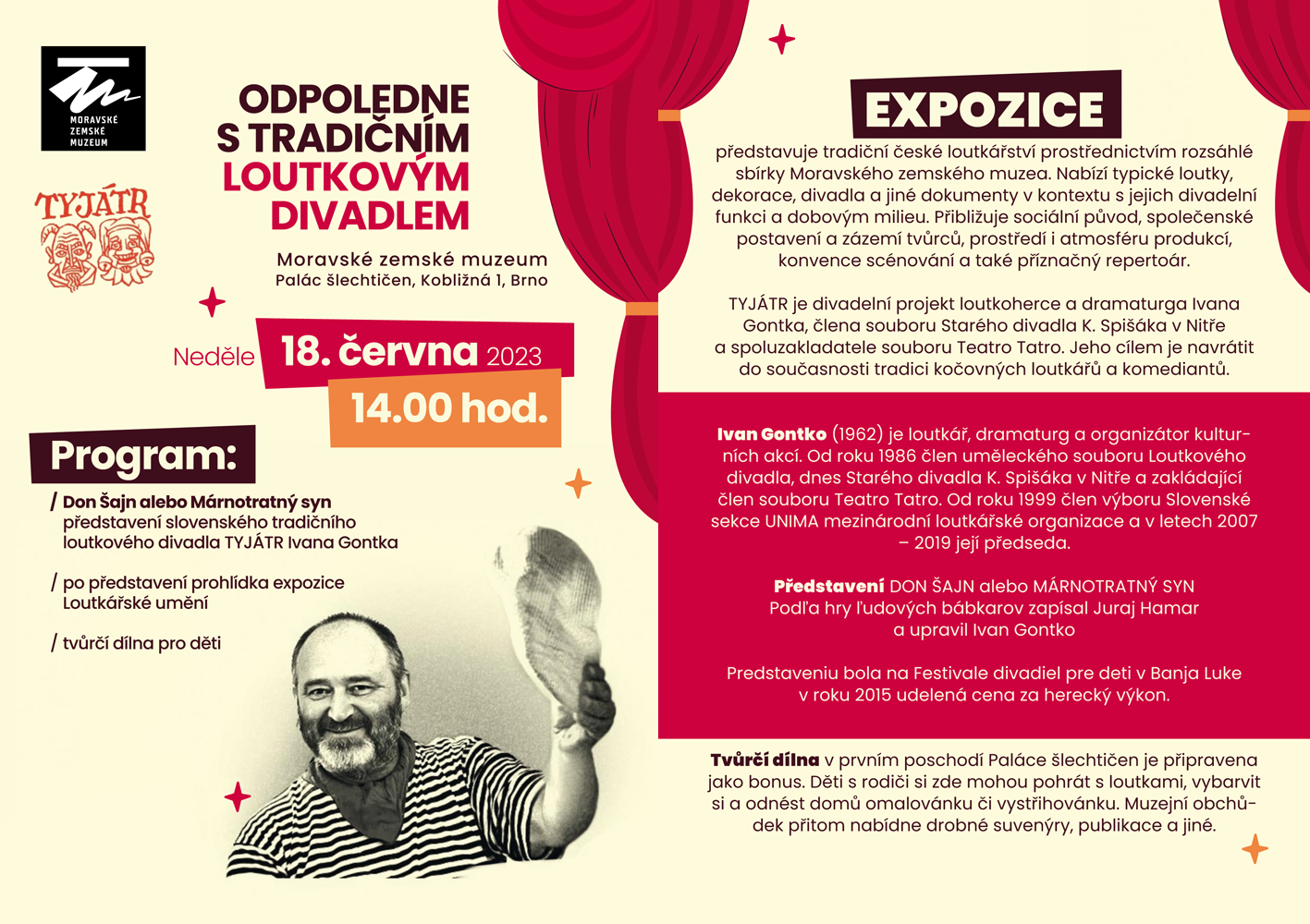 Expozice představuje tradiční české loutkářství prostřednictvím rozsáhlé sbírky Moravského zemského muzea. Nabízí typické loutky, dekorace, divadla a jiné dokumenty v kontextu s jejich divadelní funkci a dobovým milieu. Přibližuje sociální původ, společenské postavení a zázemí tvůrců, prostředí i atmosféru produkcí, konvence scénování a také příznačný repertoár.