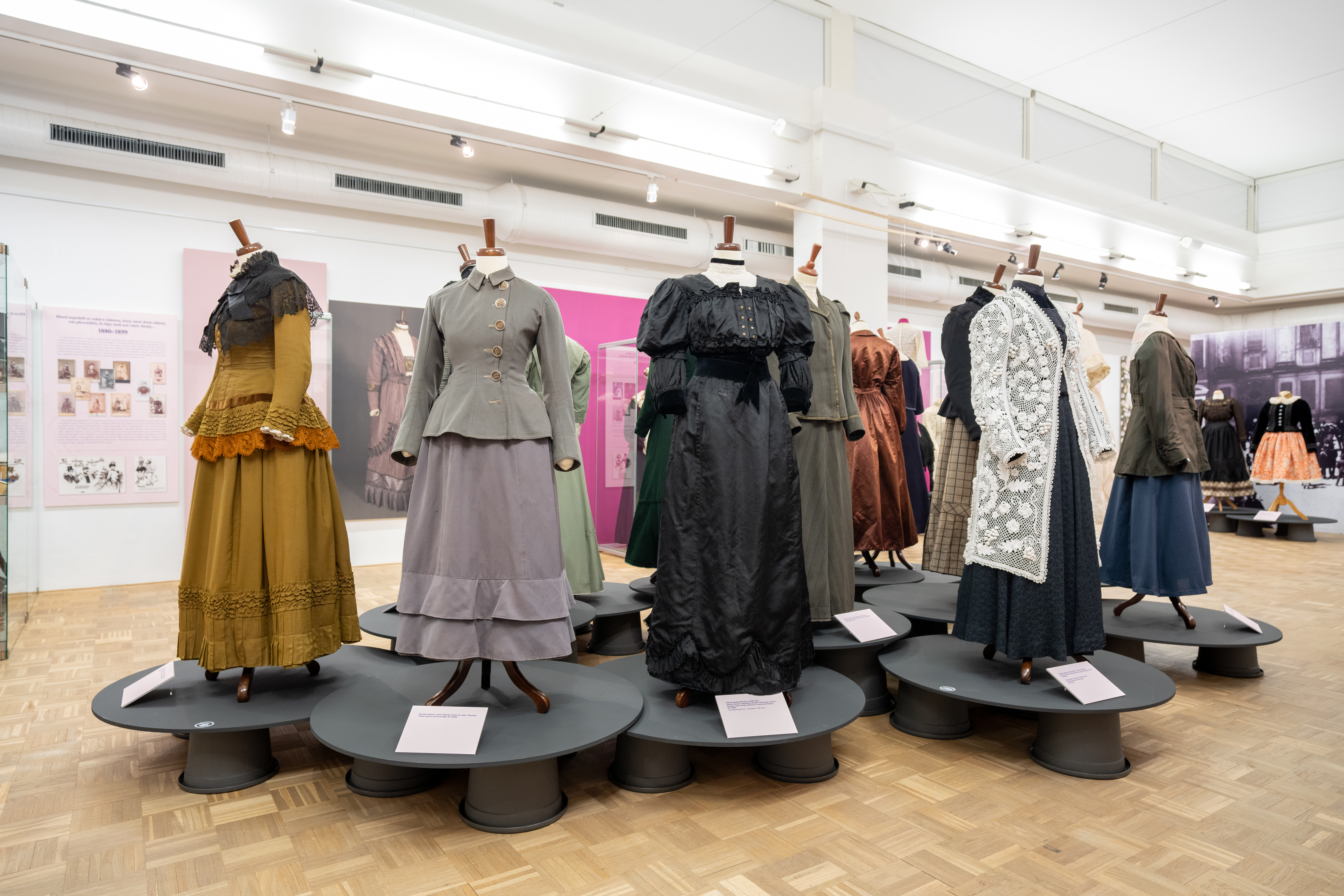 Výstava prezentuje oblečení z přelomu 19. a 20. století. Můžeme na ní vidět šaty s tzv. turnýrou, nebo šunkovými rukávy, či oděvy s takzvanou husí hrudí ze začátku 20. století, ale i přešívané komplety z období první světové války a v neposlední řadě šaty se sníženým pasem typické pro 20. léta 20. století. Konvolut 27 dámských úborů doplňují pánské obleky. Opomenuty nezůstaly ani oděvy dětí. Samostatně je pak k vidění spodní prádlo, které kromě hygienické funkce, bylo nezbytné pro správné tvarování linie svrchních šatů. Součástí výstavy jsou i desítky doplňků od obuvi, přes kabelky, knoflíky, jehlice a hřebeny do vlasů, klobouky až po slunečníky.