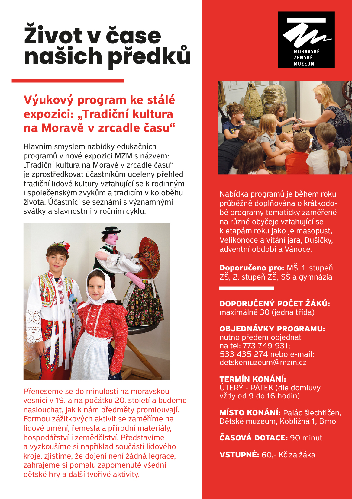 Edukační programy v nové expozici MZM s názvem Tradiční kultura na Moravě v zrcadle času zprostředkovávají účastníkům poznání lidové kultury naší země a kulturních a společenských tradic, obřadů, svátků a zvyků vážících se k průběhu lidského života a také k ročnímu cyklu. Věnovat se budeme jak stále udržovaných tradicím a slaveným svátkům, tak těm, které jsou udržovány již zřídka. Připomeneme také ty zvyklosti v minulosti významné, ale dnes již zapomenuté. Pozornost bude věnována také různým řemeslům a folklóru. Obsahově program navazuje na rámcové vzdělávací programy i průřezová témata v základním vzdělávacím systému. Zaměření programu a aktivizační prvky vždy zohledňují věkovou skupinu.
