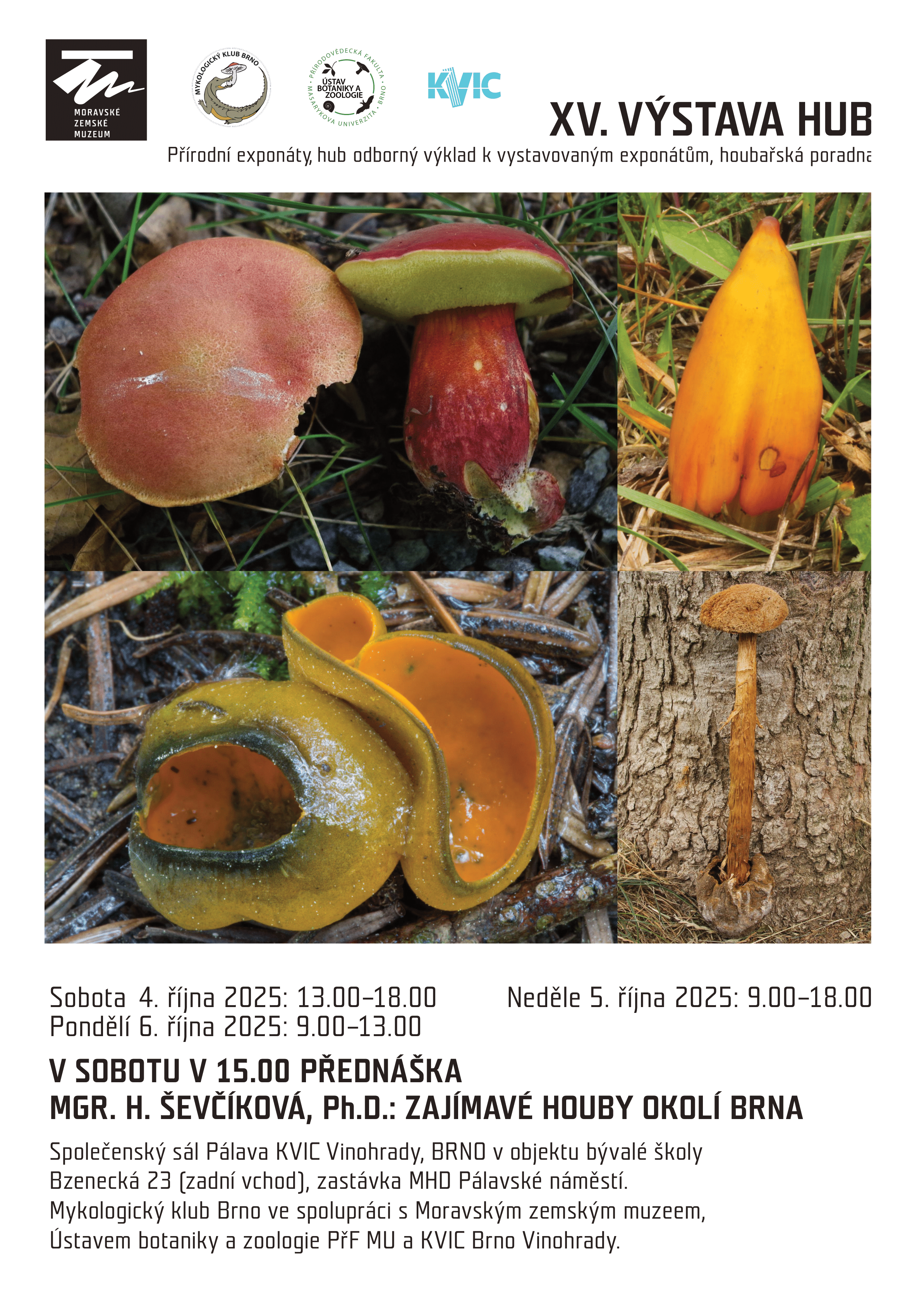 Mykologický klub Brno ve spolupráci s Moravským zemským muzeem, Ústavem botaniky a zoologie PřF MU a KVIC Brno Vinohrady Vás zvou na XV. VÝSTAVU HUB (Přírodní exponáty hub, odborný výklad k vystavovaným exponátům, houbařská poradna).