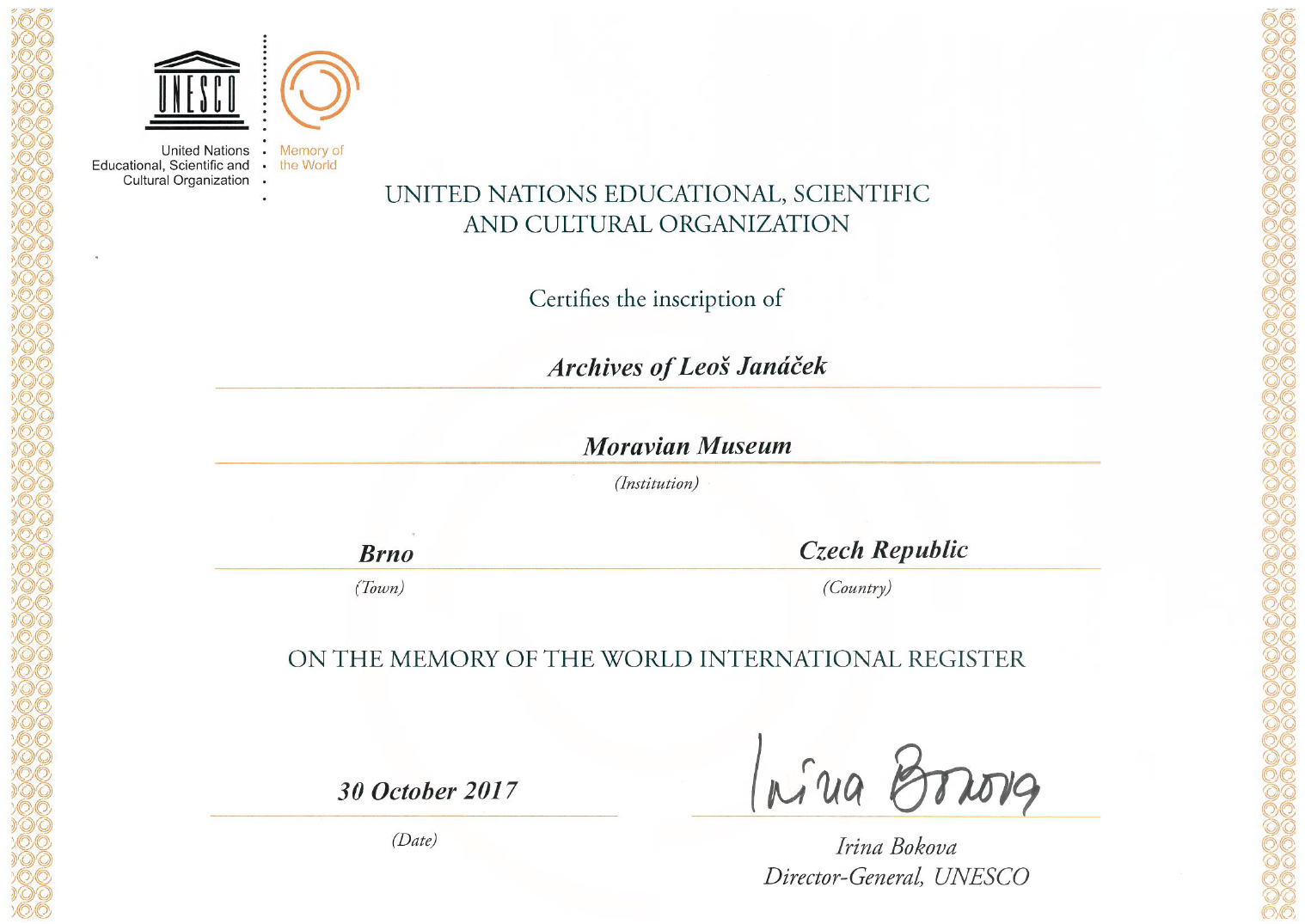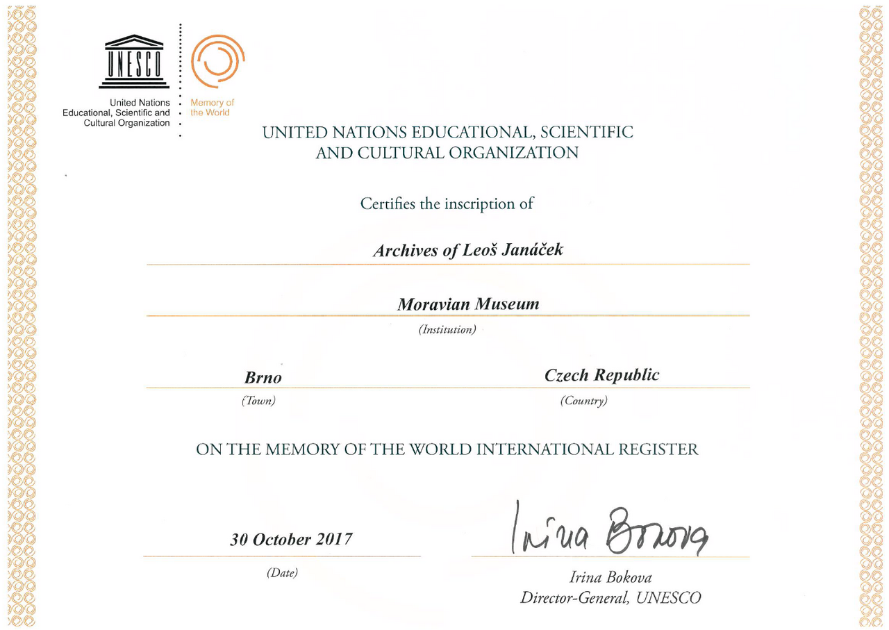 Archiv Leoše Janáčka je zapsán v mezinárodním registru Paměti světa UNESCO. "Jeho tvorba náleží k tomu nejprogresivnějšímu a nejosobitějšímu, co v hudbě nejen minulého století vzniklo. V tomto smyslu je fond jedinečným svědectvím o novodobých hudebních dějinách, resp. o počinech osobnosti, která významně předběhla svou dobu a vnesla do hudební tvorby novátorské přístupy", uvádí generální ředitel Moravského zemského muzea Jiří Mitáček. Podrobnosti naleznete v tiskové zprávě.