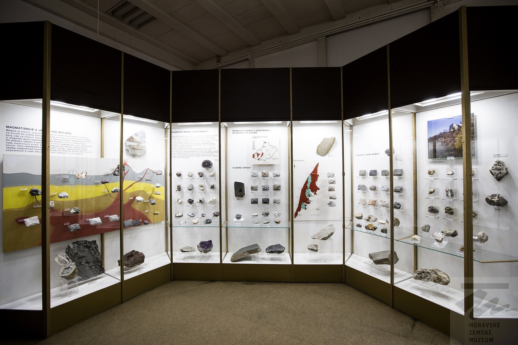 Expozice je rozdělena na tři navazující celky, které seznamují návštěvníka s nerosty a horninami s důrazem na mineralogicko-petrografické poměry Moravy a Slezska. Úvod je věnován fyzikálním a chemickým vlastnostem nerostů a je zakončen informacemi o stavbě Země a jejím postavení ve sluneční soustavě.